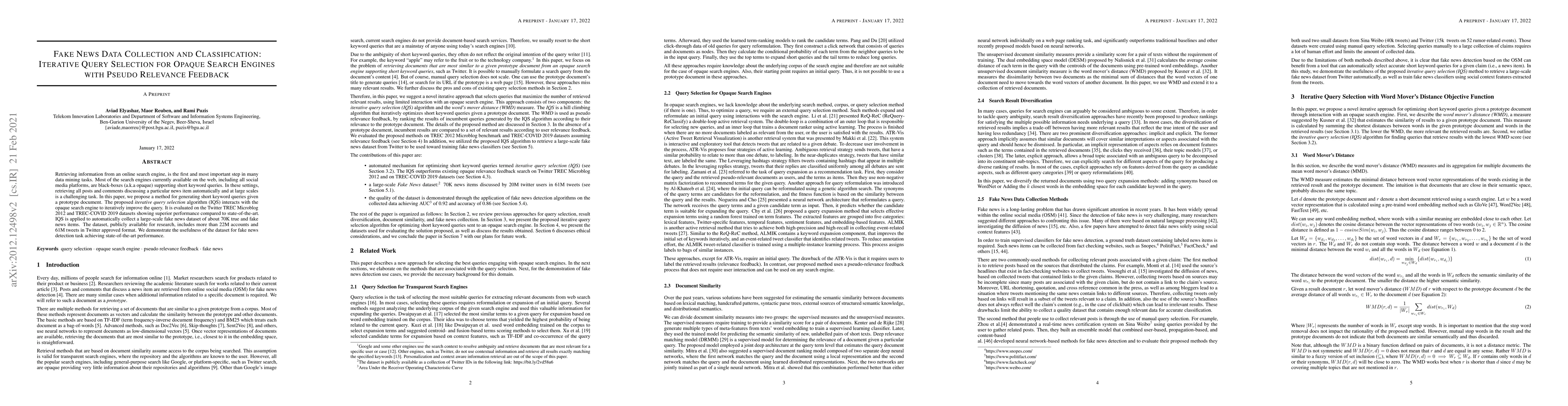 This paper proposes an iterative query selection algorithm (IQS) for retrieving large-scale posts and comments on opaque search engines, particularly for fake news detection. The method improves query performance through pseudo relevance feedback and is shown to outperform state-of-the-art on Twitter datasets, leading to a new large-scale fake news dataset that achieves top performance in detection tasks.