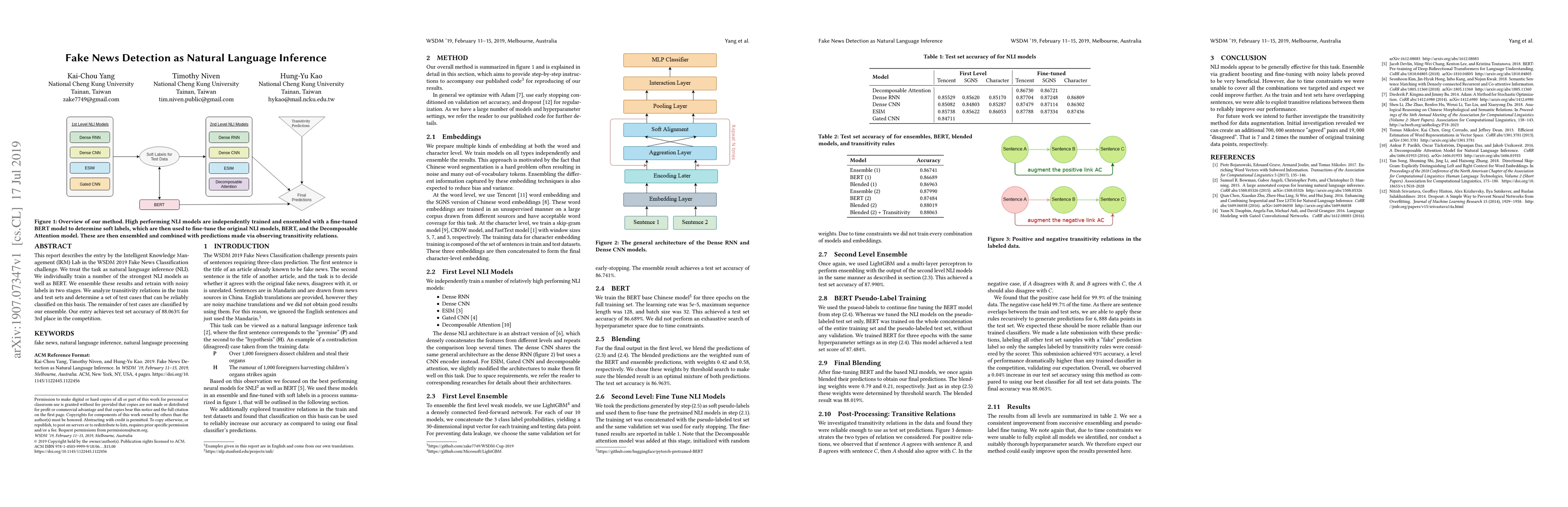 This report describes the entry by the Intelligent Knowledge Management (IKM) Lab in the WSDM 2019 Fake News Classification challenge. We treat the task as natural language inference (NLI). We individually train a number of the strongest NLI models as well as BERT. We ensemble these results and retrain with noisy labels in two stages. We analyze transitivity relations in the train and test sets and determine a set of test cases that can be reliably classified on this basis. The remainder of test cases are classified by our ensemble. Our entry achieves test set accuracy of 88.063% for 3rd place in the competition.