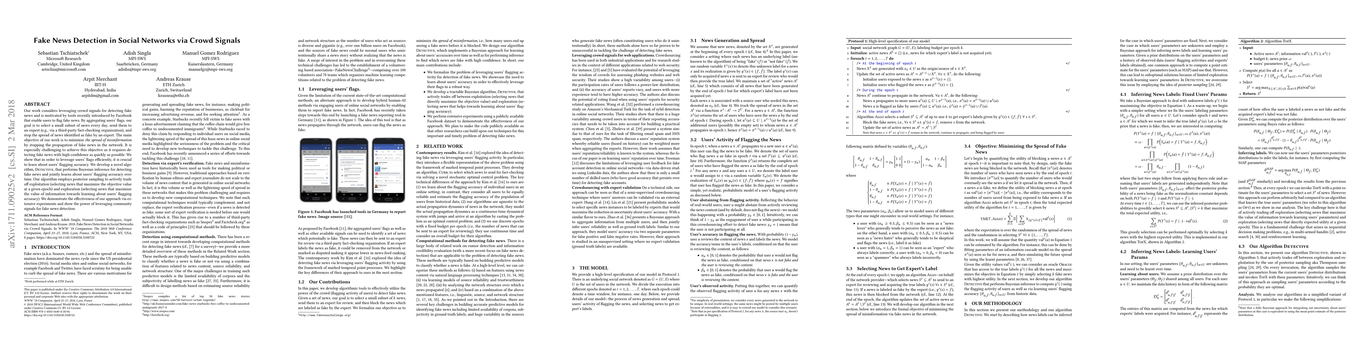 This paper proposes a method to detect fake news in social networks by leveraging crowd signals and expert validation. The DETECTIVE algorithm uses Bayesian inference to learn users' flagging accuracy and balances exploitation and exploration to efficiently identify fake news, aiming to minimize misinformation spread.