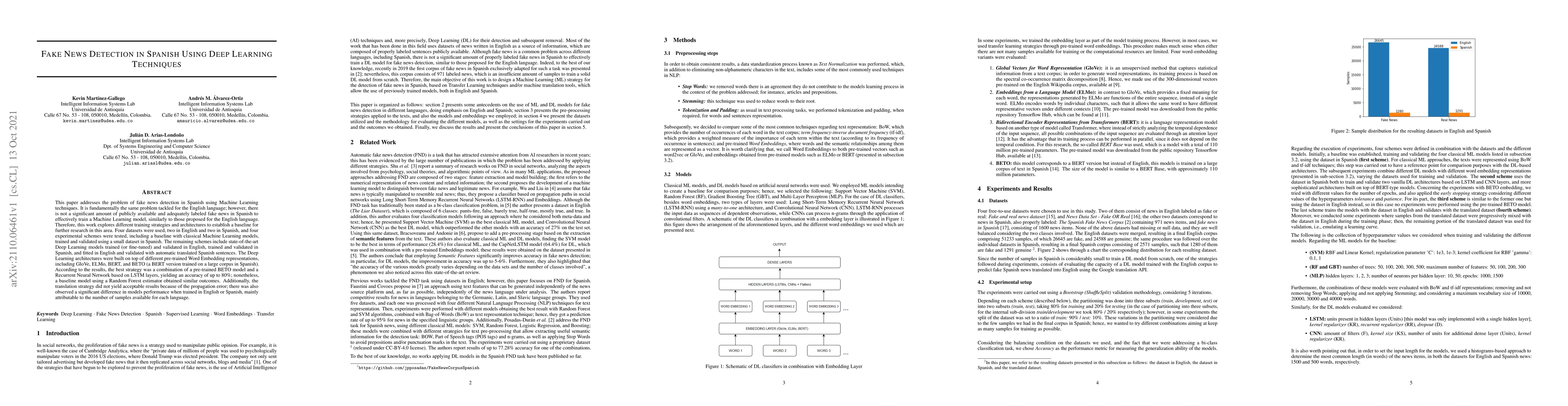 This research paper explores fake news detection in Spanish using deep learning techniques due to limited labeled data available for training. A combination of pre-trained BETO model and Recurrent Neural Network achieved an accuracy of up to 80%.