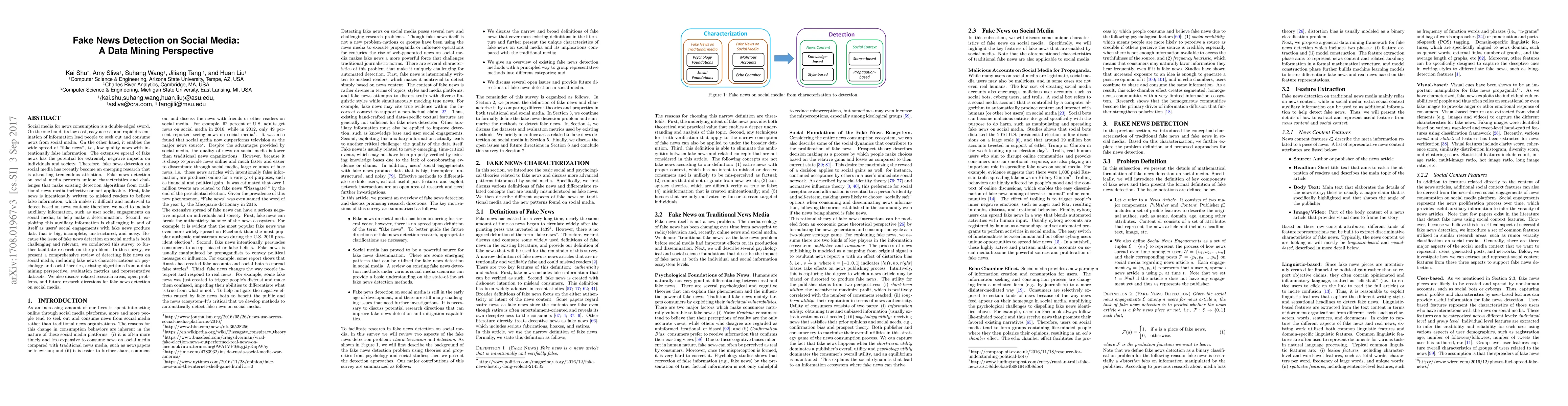 Social media for news consumption is a double-edged sword. On the one hand, its low cost, easy access, and rapid dissemination of information lead people to seek out and consume news from social media. On the other hand, it enables the wide spread of "fake news", i.e., low quality news with intentionally false information. The extensive spread of fake news has the potential for extremely negative impacts on individuals and society. Therefore, fake news detection on social media has recently become an emerging research that is attracting tremendous attention. Fake news detection on social media presents unique characteristics and challenges that make existing detection algorithms from traditional news media ineffective or not applicable. First, fake news is intentionally written to mislead readers to believe false information, which makes it difficult and nontrivial to detect based on news content; therefore, we need to include auxiliary information, such as user social engagements on social media, to help make a determination. Second, exploiting this auxiliary information is challenging in and of itself as users' social engagements with fake news produce data that is big, incomplete, unstructured, and noisy. Because the issue of fake news detection on social media is both challenging and relevant, we conducted this survey to further facilitate research on the problem. In this survey, we present a comprehensive review of detecting fake news on social media, including fake news characterizations on psychology and social theories, existing algorithms from a data mining perspective, evaluation metrics and representative datasets. We also discuss related research areas, open problems, and future research directions for fake news detection on social media.