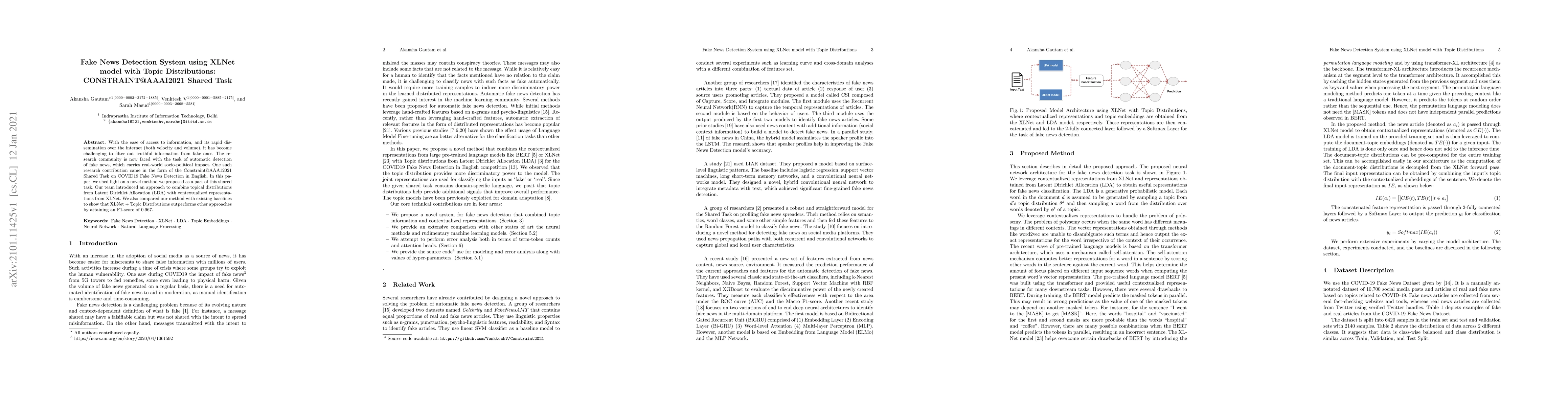 This paper proposes a novel fake news detection system combining XLNet contextualized representations with Latent Dirichlet Allocation (LDA) topical distributions. The method achieved an F1-score of 0.967 in the Constraint@AAAI2021 Shared Task, outperforming existing baselines.