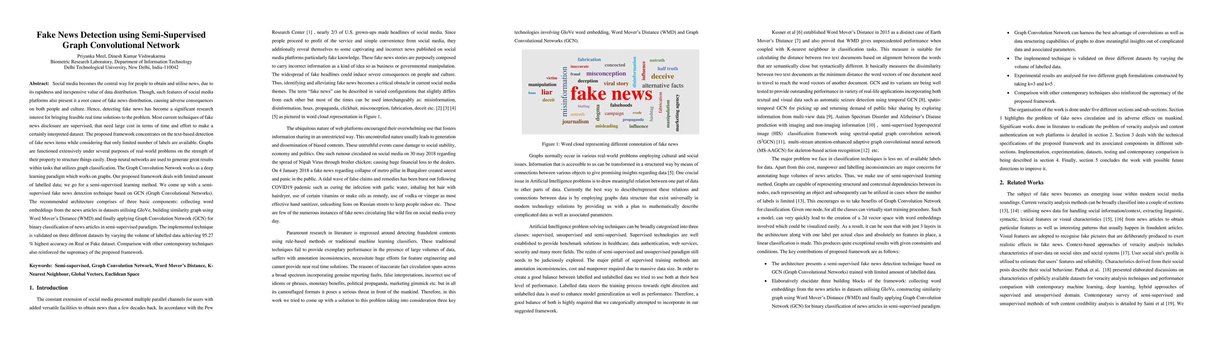 Social media becomes the central way for people to obtain and utilise news, due to its rapidness and inexpensive value of data distribution. Though, such features of social media platforms also present it a root cause of fake news distribution, causing adverse consequences on both people and culture. Hence, detecting fake news has become a significant research interest for bringing feasible real time solutions to the problem. Most current techniques of fake news disclosure are supervised, that need large cost in terms of time and effort to make a certainly interpreted dataset. The proposed framework concentrates on the text-based detection of fake news items while considering that only limited number of labels are available. Graphs are functioned extensively under several purposes of real-world problems on the strength of their property to structure things easily. Deep neural networks are used to generate great results within tasks that utilizes graph classification. The Graph Convolution Network works as a deep learning paradigm which works on graphs. Our proposed framework deals with limited amount of labelled data; we go for a semi-supervised learning method. We come up with a semi-supervised fake news detection technique based on GCN (Graph Convolutional Networks). The recommended architecture comprises of three basic components: collecting word embeddings from the news articles in datasets utilising GloVe, building similarity graph using Word Movers Distance (WMD) and finally applying Graph Convolution Network (GCN) for binary classification of news articles in semi-supervised paradigm. The implemented technique is validated on three different datasets by varying the volume of labelled data achieving 95.27 % highest accuracy on Real or Fake dataset. Comparison with other contemporary techniques also reinforced the supremacy of the proposed framework.