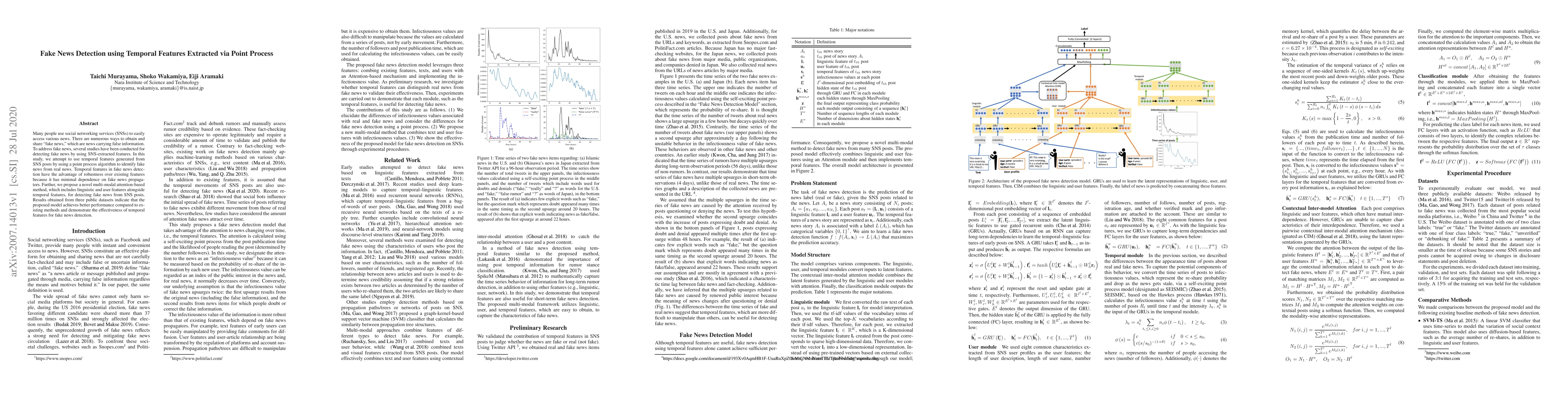 This paper proposes a method to detect fake news on social networking services using temporal features extracted via point process and a multi-modal attention-based model incorporating linguistic and user features. The study shows improved detection performance over existing methods, highlighting the robustness of temporal features.