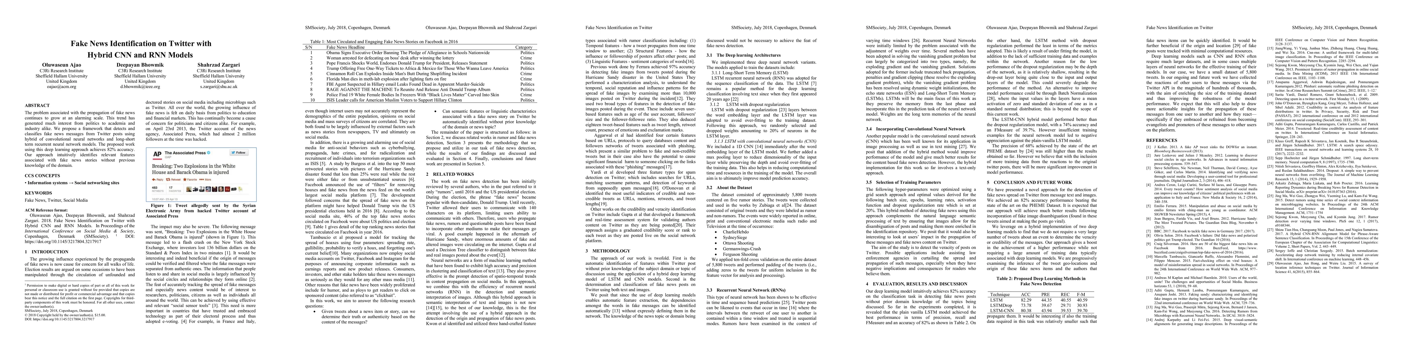 Here's a concise summary of the research paper: This study introduces a framework for detecting and classifying fake news on Twitter using a hybrid model combining convolutional neural networks (CNN) and long short-term memory networks (RNN). The proposed deep learning approach achieves 82% accuracy in identifying fake news, leveraging relevant features without requiring prior knowledge of the specific domain.