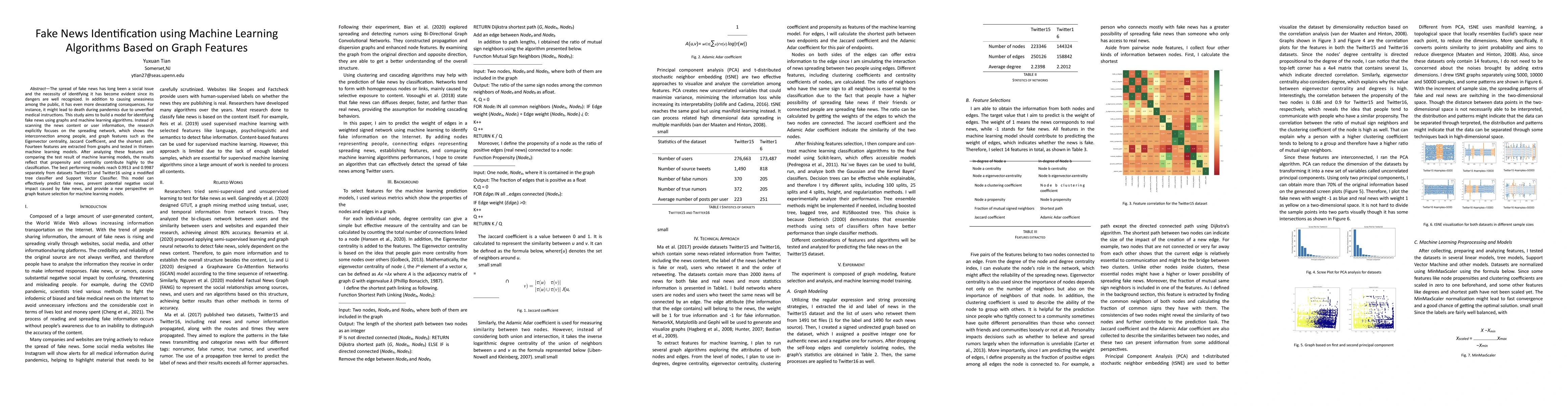 The spread of fake news has long been a social issue and the necessity of identifying it has become evident since its dangers are well recognized. In addition to causing uneasiness among the public, it has even more devastating consequences. For instance, it might lead to death during pandemics due to unverified medical instructions. This study aims to build a model for identifying fake news using graphs and machine learning algorithms. Instead of scanning the news content or user information, the research explicitly focuses on the spreading network, which shows the interconnection among people, and graph features such as the Eigenvector centrality, Jaccard Coefficient, and the shortest path. Fourteen features are extracted from graphs and tested in thirteen machine learning models. After analyzing these features and comparing the test result of machine learning models, the results reflect that propensity and centrality contribute highly to the classification. The best performing models reach 0.9913 and 0.9987 separately from datasets Twitter15 and Twitter16 using a modified tree classifier and Support Vector Classifier. This model can effectively predict fake news, prevent potential negative social impact caused by fake news, and provide a new perspective on graph feature selection for machine learning models.