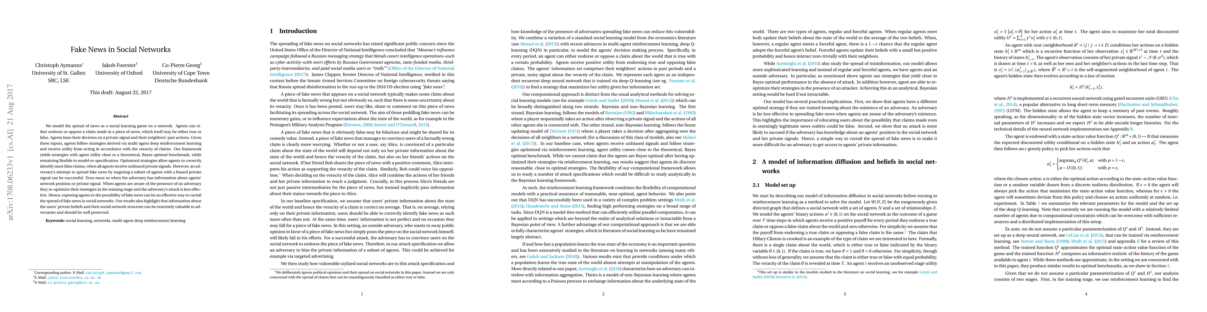 We model the spread of news as a social learning game on a network. Agents can either endorse or oppose a claim made in a piece of news, which itself may be either true or false. Agents base their decision on a private signal and their neighbors' past actions. Given these inputs, agents follow strategies derived via multi-agent deep reinforcement learning and receive utility from acting in accordance with the veracity of claims. Our framework yields strategies with agent utility close to a theoretical, Bayes optimal benchmark, while remaining flexible to model re-specification. Optimized strategies allow agents to correctly identify most false claims, when all agents receive unbiased private signals. However, an adversary's attempt to spread fake news by targeting a subset of agents with a biased private signal can be successful. Even more so when the adversary has information about agents' network position or private signal. When agents are aware of the presence of an adversary they re-optimize their strategies in the training stage and the adversary's attack is less effective. Hence, exposing agents to the possibility of fake news can be an effective way to curtail the spread of fake news in social networks. Our results also highlight that information about the users' private beliefs and their social network structure can be extremely valuable to adversaries and should be well protected.
