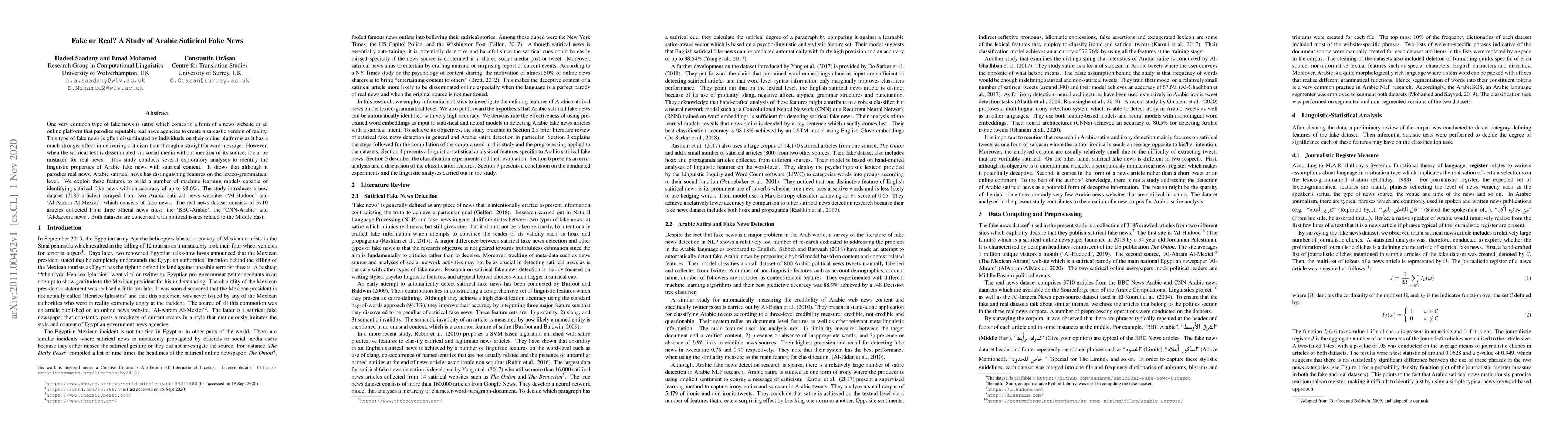 This study investigates the linguistic characteristics of Arabic satirical fake news to develop machine learning models that can identify such content with high accuracy (up to 98.6%). The research focuses on how satirical fake news, often mistaken for real news on social media, is disseminated and its impact.