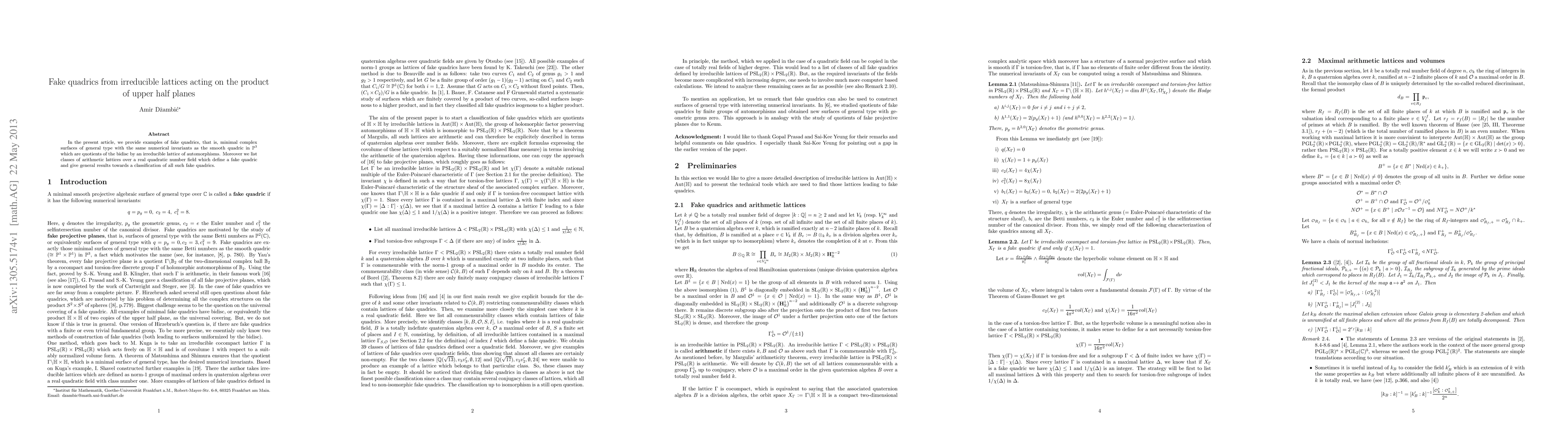 This paper presents examples of fake quadrics, minimal complex surfaces with the same invariants as the smooth quadric in $\PP^3$, arising as quotients of the bidisc by irreducible lattices. It also classifies arithmetic lattices over real quadratic fields that define these fake quadrics and provides general results towards their classification.