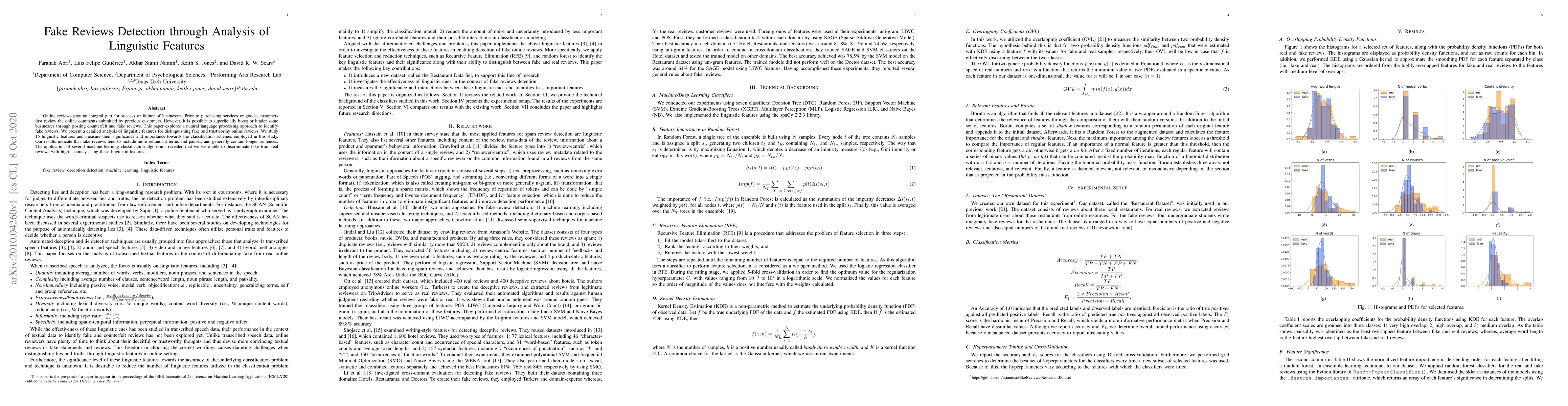 This paper investigates the use of natural language processing to detect fake online reviews by analyzing linguistic features. The study identifies significant linguistic markers such as redundant terms, pauses, and longer sentences, which are more prevalent in fake reviews, and demonstrates high accuracy in classification using machine learning algorithms.