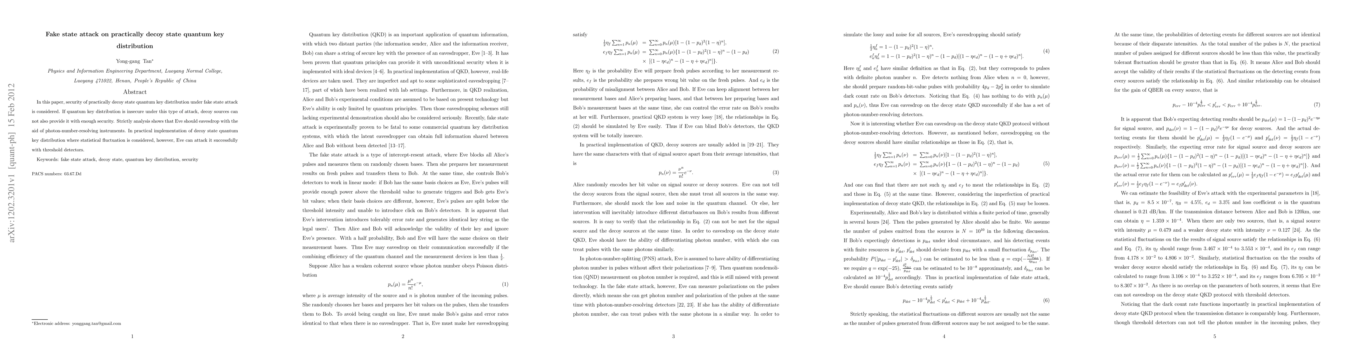 In this paper, security of practically decoy state quantum key distribution under fake state attack is considered. If quantum key distribution is insecure under this type of attack, decoy sources can not also provide it with enough security. Strictly analysis shows that Eve should eavesdrop with the aid of photon-number-resolving instruments. In practical implementation of decoy state quantum key distribution where statistical fluctuation is considered, however, Eve can attack it successfully with threshold detectors.