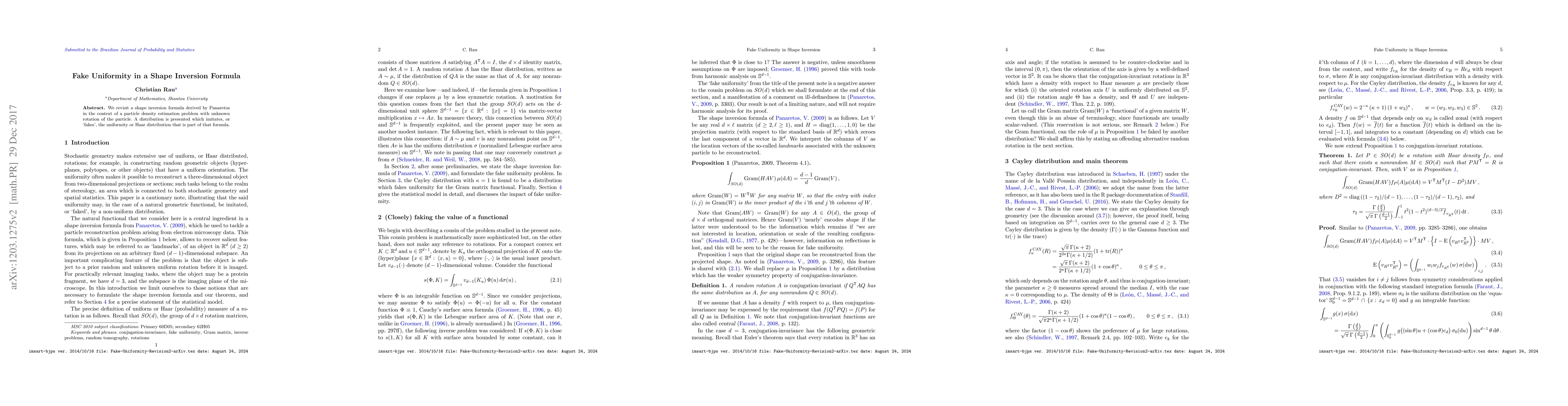 We revisit a shape inversion formula derived by Panaretos in the context of a particle density estimation problem with unknown rotation of the particle. A distribution is presented which imitates, or 'fakes', the uniformity or Haar distribution that is part of that formula.