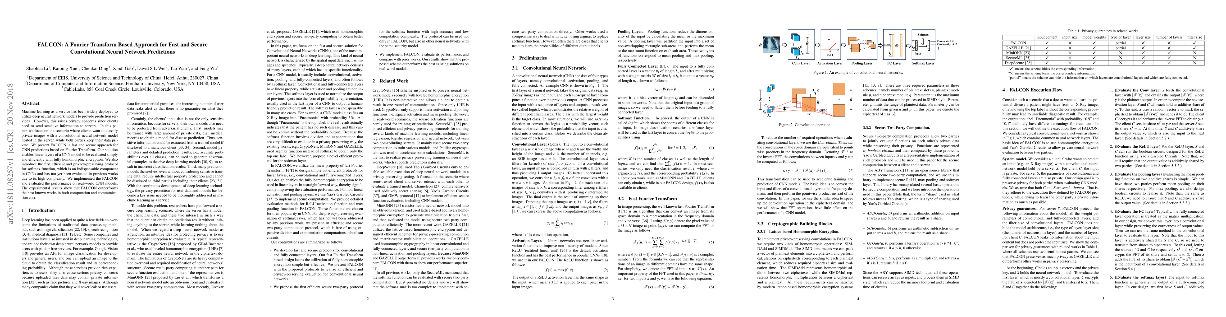 FALCON is a novel Fourier Transform-based approach for secure convolutional neural network predictions, enabling linear layers and a new efficient protocol for the softmax function while maintaining privacy. Experimental results demonstrate FALCON's superior performance in computation and communication costs compared to existing methods.