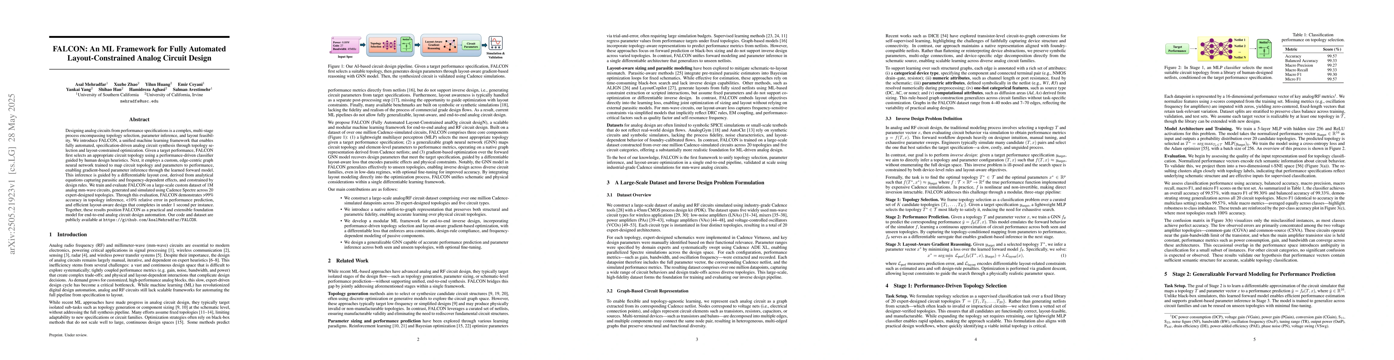 FALCON is a machine learning framework that automates analog circuit design from performance specifications, achieving 99% accuracy in topology inference and efficient layout-aware design.