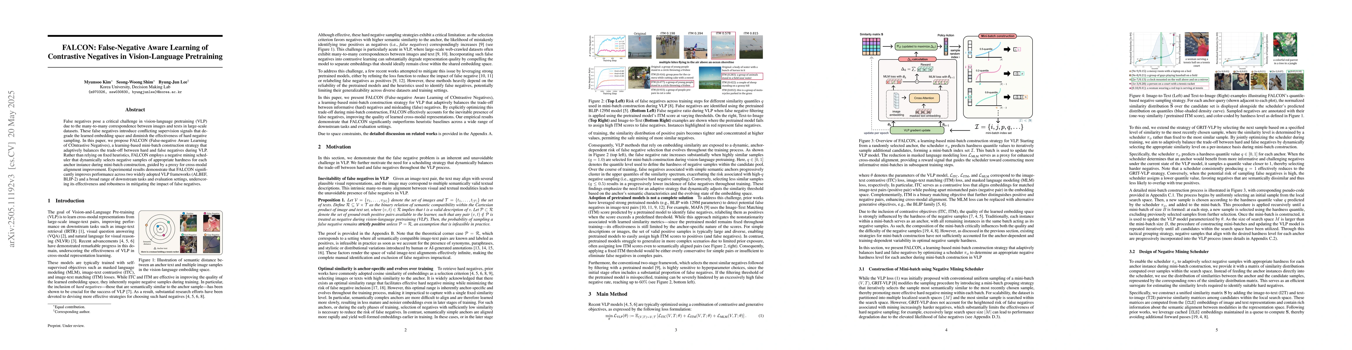 FALCON improves vision-language pretraining by adapting to false negatives, balancing hard and false negative samples during mini-batch construction.