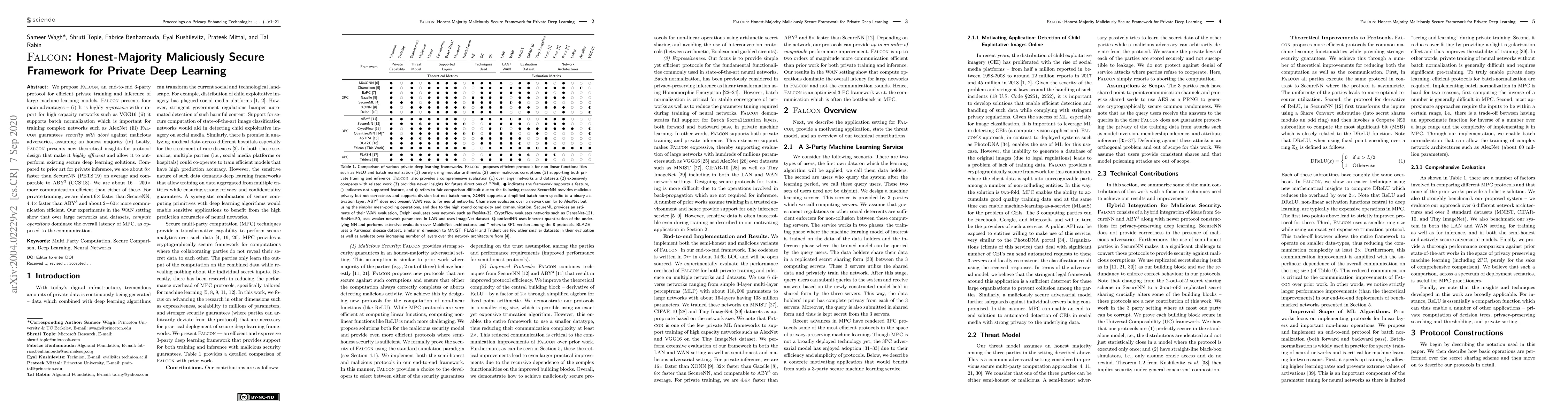 Falcon is a 3-party protocol for secure private training and inference of deep learning models, supporting complex networks and batch normalization. It offers security against malicious adversaries, is highly efficient, and outperforms existing solutions in speed and communication efficiency.