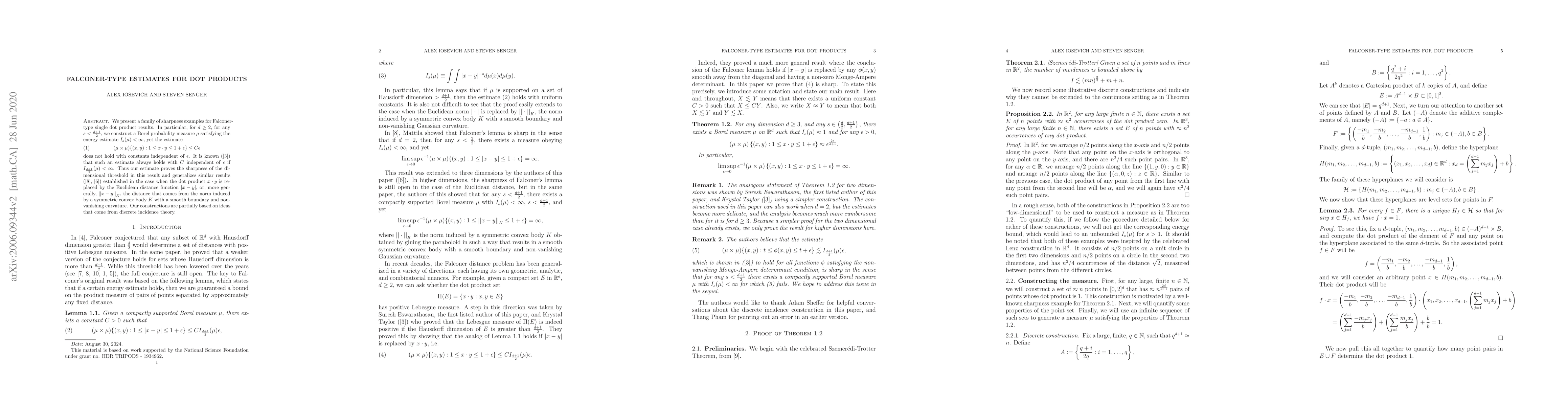 We present a family of sharpness examples for Falconer-type single dot product results. In particular, for $d\geq 2,$ for any $s<\frac{d+1}{2},$ we construct a Borel probability measure $\mu$ satisfying the energy estimate $I_s(\mu)<\infty,$ yet the estimate \begin{equation} (\mu \times \mu)\{(x,y):1\leq x\cdot y \leq 1+\epsilon\} \leq C\epsilon \end{equation} does not hold with constants independent of $\epsilon$. It is known (\cite{EIT11}) that such an estimate always holds with $C$ independent of $\epsilon$ if $I_{\frac{d+1}{2}}(\mu)<\infty$. Thus our estimate proves the sharpness of the dimensional threshold in this result and generalizes similar results (\cite{Mat95}, \cite{IS16}) established in the case when the dot product $x \cdot y$ is replaced by the Euclidean distance function $|x-y|$, or, more generally, ${||x-y||}_K$, the distance that comes from the norm induced by a symmetric convex body $K$ with a smooth boundary and non-vanishing curvature. Our constructions are partially based on ideas that come from discrete incidence theory.