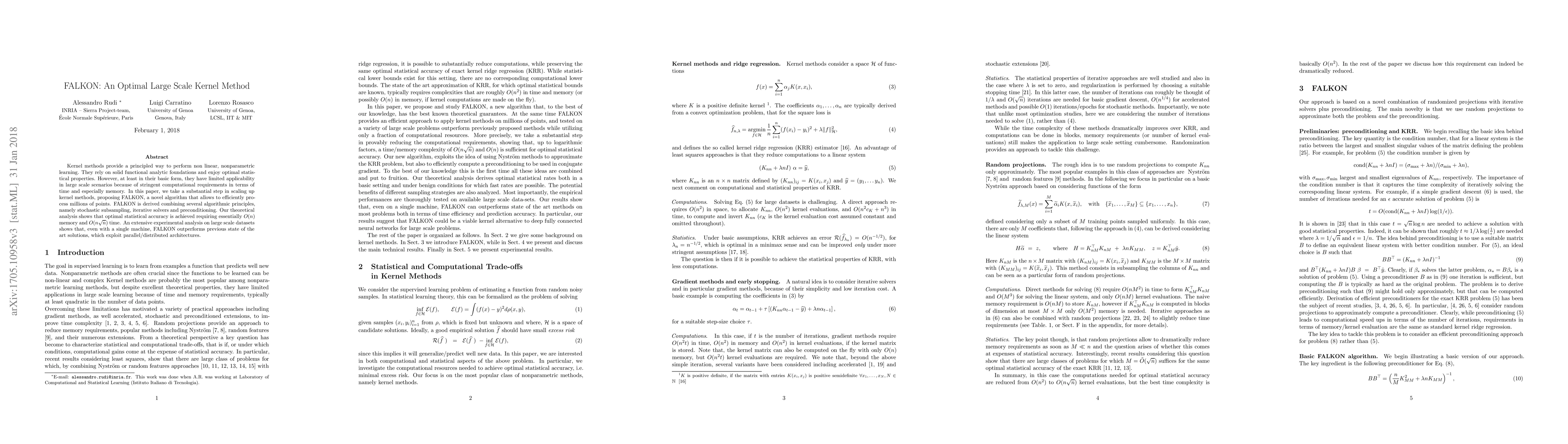 FALKON scales up kernel methods to process millions of points, achieving optimal statistical accuracy with O(n) memory and O(n¸n) time, outperforming previous state-of-the-art solutions on large-scale datasets.