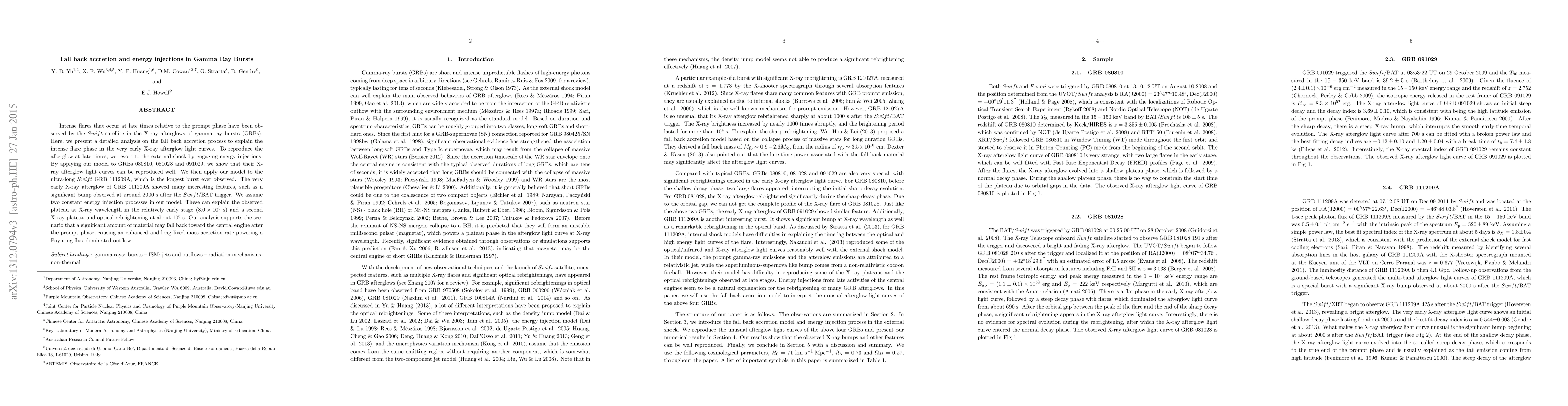 This paper analyzes the fallback accretion process and energy injections to explain intense flares in the X-ray afterglows of gamma-ray bursts (GRBs). The model successfully reproduces the X-ray afterglow light curves of GRBs 080810, 081028, and 091029, and explains the features of ultra-long GRB 111209A, including significant X-ray plateaus and optical rebrightening.