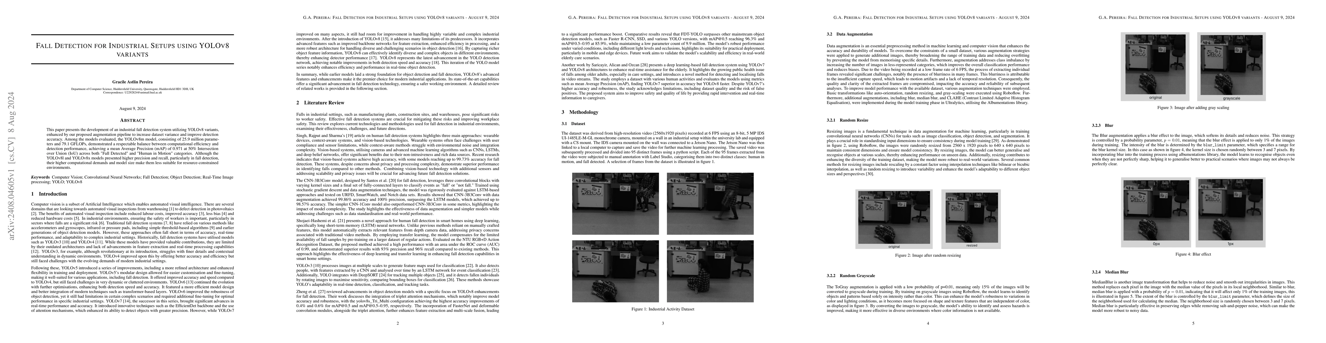 This paper presents the development of an industrial fall detection system utilizing YOLOv8 variants, enhanced by our proposed augmentation pipeline to increase dataset variance and improve detection accuracy. Among the models evaluated, the YOLOv8m model, consisting of 25.9 million parameters and 79.1 GFLOPs, demonstrated a respectable balance between computational efficiency and detection performance, achieving a mean Average Precision (mAP) of 0.971 at 50% Intersection over Union (IoU) across both "Fall Detected" and "Human in Motion" categories. Although the YOLOv8l and YOLOv8x models presented higher precision and recall, particularly in fall detection, their higher computational demands and model size make them less suitable for resource-constrained environments.