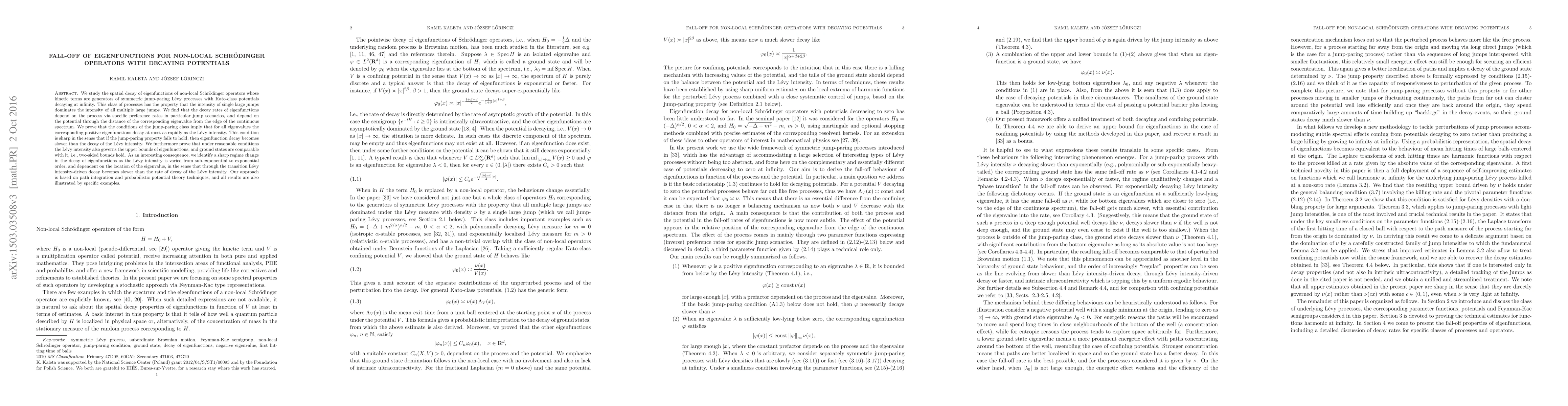 We study the spatial decay of eigenfunctions of non-local Schr\"odinger operators whose kinetic terms are generators of symmetric jump-paring L\'evy processes with Kato-class potentials decaying at infinity. This class of processes has the property that the intensity of single large jumps dominates the intensity of all multiple large jumps. We find that the decay rates of eigenfunctions depend on the process via specific preference rates in particular jump scenarios, and depend on the potential through the distance of the corresponding eigenvalue from the edge of the continuous spectrum. We prove that the conditions of the jump-paring class imply that for all eigenvalues the corresponding positive eigenfunctions decay at most as rapidly as the L\'evy intensity. This condition is sharp in the sense that if the jump-paring property fails to hold, then eigenfunction decay becomes slower than the decay of the L\'evy intensity. We furthermore prove that under reasonable conditions the L\'evy intensity also governs the upper bounds of eigenfunctions, and ground states are comparable with it, i.e., two-sided bounds hold. As an interesting consequence, we identify a sharp regime change in the decay of eigenfunctions as the L\'evy intensity is varied from sub-exponential to exponential order, and dependent on the location of the eigenvalue, in the sense that through the transition L\'evy intensity-driven decay becomes slower than the rate of decay of L\'evy intensity. Our approach is based on path integration and probabilistic potential theory techniques, and all results are also illustrated by specific examples.