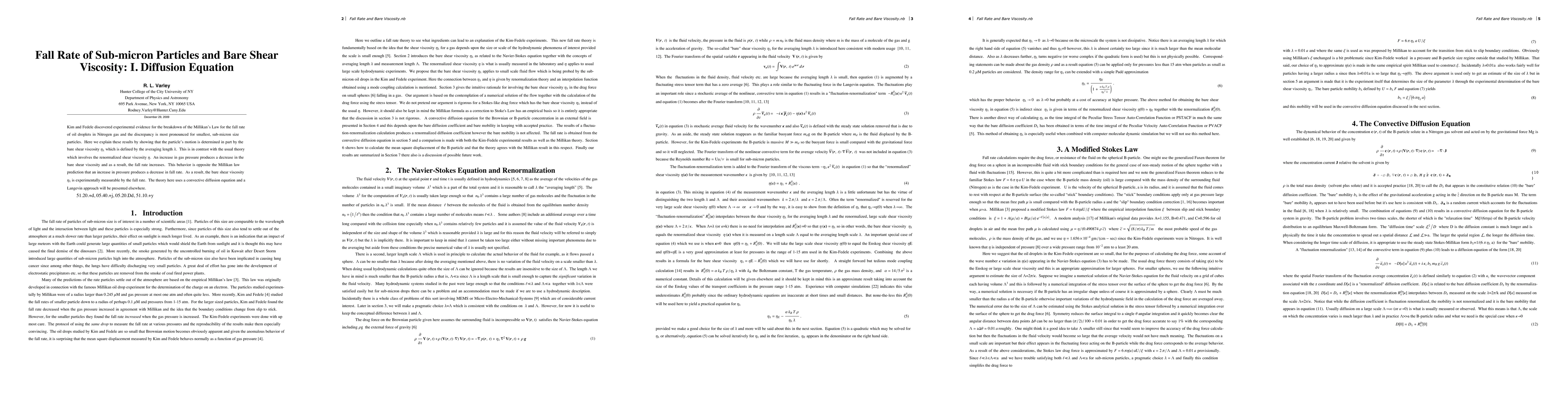 Kim and Fedele discovered experimental evidence for the breakdown of the Millikan's Law for the fall rate of oil droplets in Nitrogen gas and the discrepancy is most pronounced for the smallest, sub-micron size particles. Here we explain these results by showing that the particle's motion is determined in part by the bare shear viscosity which is defined by the averaging length lambda. This is in contrast to the usual theory which involves the renormalized shear viscosity. An increase in gas pressure produces a decrease in the bare shear viscosity and as a result the fall rate increases. This behavior is opposite the Millikan Law prediction that an increase in pressure produces a decrease in fall rate. As a result, the bare shear viscosity is experimentally measurable by the fallrate. The theory here uses a convective diffusion equation and a Langevin approach will be presented elsewhere.