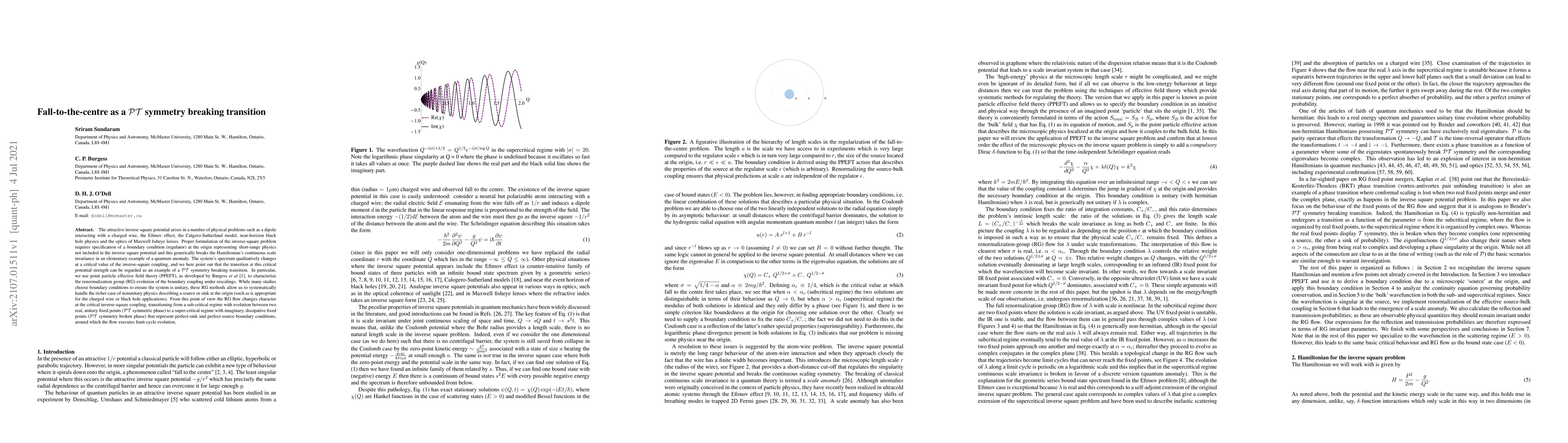 This research identifies the fall-to-the-centre phenomenon in the attractive inverse square potential as a $mathcal{PT}$ symmetry breaking transition. Utilizing Point Particle Effective Field Theory (PPEFT), the study characterizes the renormalization group (RG) evolution of boundary couplings, revealing a shift from a unitary phase with real fixed points to a non-unitary phase with imaginary fixed points at the critical coupling strength, signifying $mathcal{PT}$ symmetry breaking.