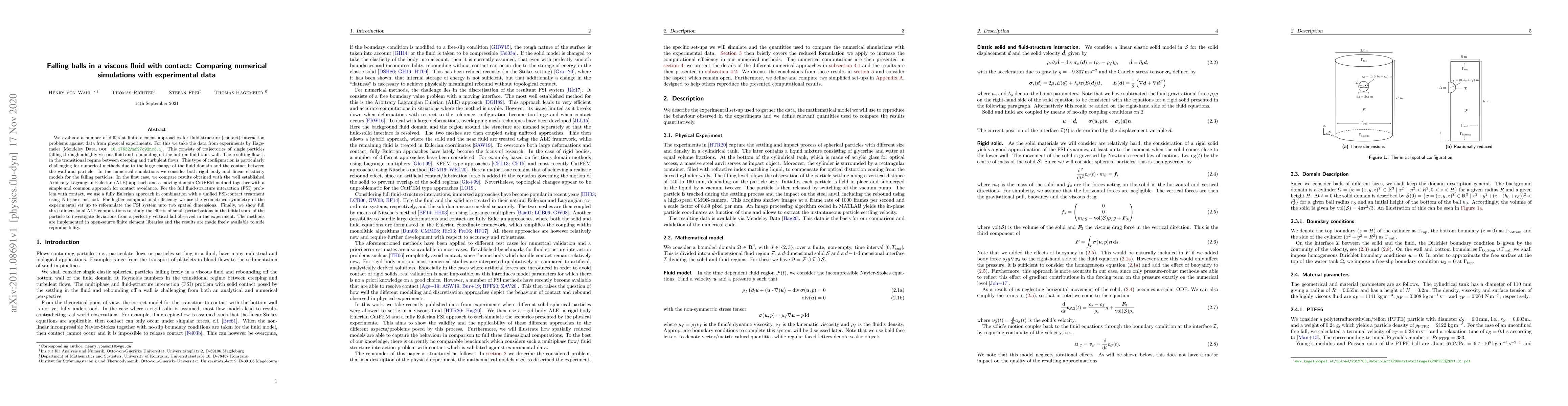 We evaluate a number of different finite element approaches for fluid-structure (contact) interaction problems against data from physical experiments. For this we take the data from experiments by Hagemeier [Mendeley Data, doi: 10.17632/mf27c92nc3.1]. This consists of trajectories of single particles falling through a highly viscous fluid and rebounding off the bottom fluid tank wall. The resulting flow is in the transitional regime between creeping and turbulent flows. This type of configuration is particularly challenging for numerical methods due to the large change of the fluid domain and the contact between the wall and particle. In the numerical simulations we consider both rigid body and linear elasticity models for the falling particles. In the first case, we compare results obtained with the well established Arbitrary Lagrangian Eulerian (ALE) approach and a moving domain CutFEM method together with a simple and common approach for contact avoidance. For the full fluid-structure interaction (FSI) problem with contact, we use a fully Eulerian approach in combination with a unified FSI-contact treatment using Nitsche's method. For higher computational efficiency we use the geometrical symmetry of the experimental set up to reformulate the FSI system into two spatial dimensions. Finally, we show full three dimensional ALE computations to study the effects of small perturbations in the initial state of the particle to investigate deviations from a perfectly vertical fall observed in the experiment. The methods are implemented in open-source finite element libraries and the results are made freely available to aide reproducibility.