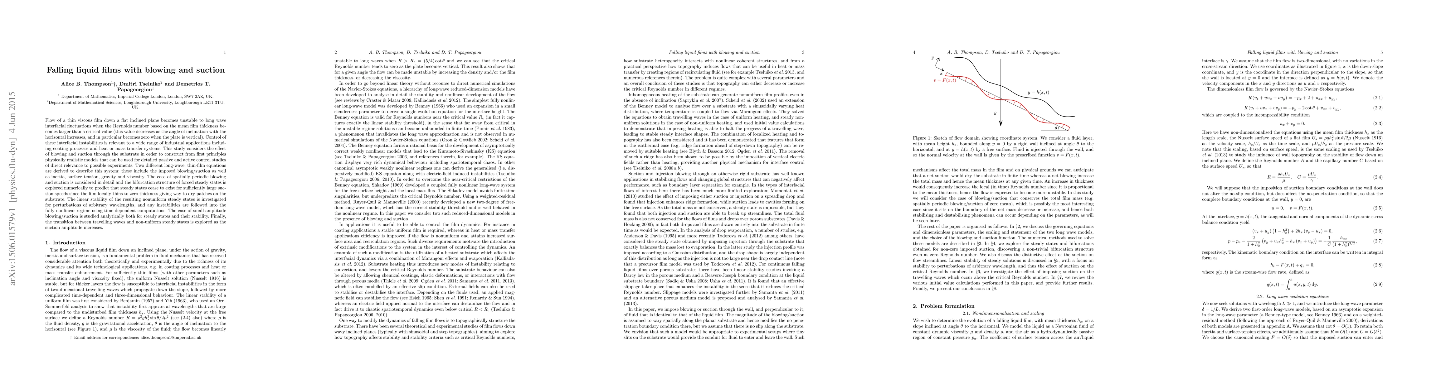 Flow of a thin viscous film down a flat inclined plane becomes unstable to long wave interfacial fluctuations when the Reynolds number based on the mean film thickness becomes larger than a critical value (this value decreases as the angle of inclination with the horizontal increases, and in particular becomes zero when the plate is vertical). Control of these interfacial instabilities is relevant to a wide range of industrial applications including coating processes and heat or mass transfer systems. This study considers the effect of blowing and suction through the substrate in order to construct from first principles physically realistic models that can be used for detailed passive and active control studies of direct relevance to possible experiments. Two different long-wave, thin-film equations are derived to describe this system; these include the imposed blowing/suction as well as inertia, surface tension, gravity and viscosity. The case of spatially periodic blowing and suction is considered in detail and the bifurcation structure of forced steady states is explored numerically to predict that steady states cease to exist for sufficiently large suction speeds since the film locally thins to zero thickness giving way to dry patches on the substrate. The linear stability of the resulting nonuniform steady states is investigated for perturbations of arbitrary wavelengths, and any instabilities are followed into the fully nonlinear regime using time-dependent computations. The case of small amplitude blowing/suction is studied analytically both for steady states and their stability. Finally, the transition between travelling waves and non-uniform steady states is explored as the suction amplitude increases.