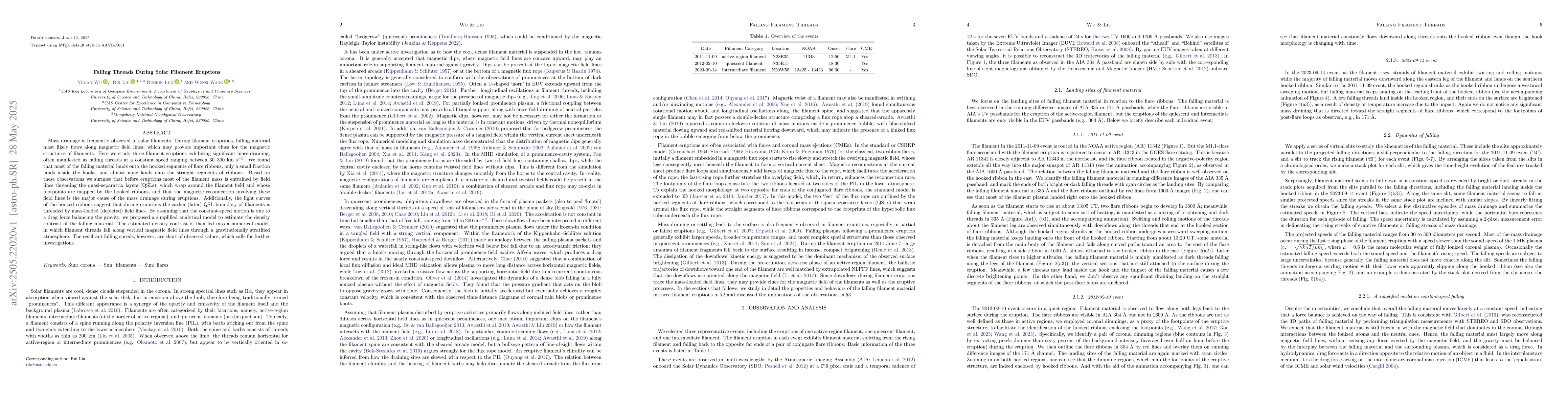 The study analyzes three solar filament eruptions with significant mass drainage, observing falling threads at constant speeds between 30--300 km/s. It uses observations of where the falling material lands on flare ribbons and proposes a simplified analytical model to estimate density contrast.