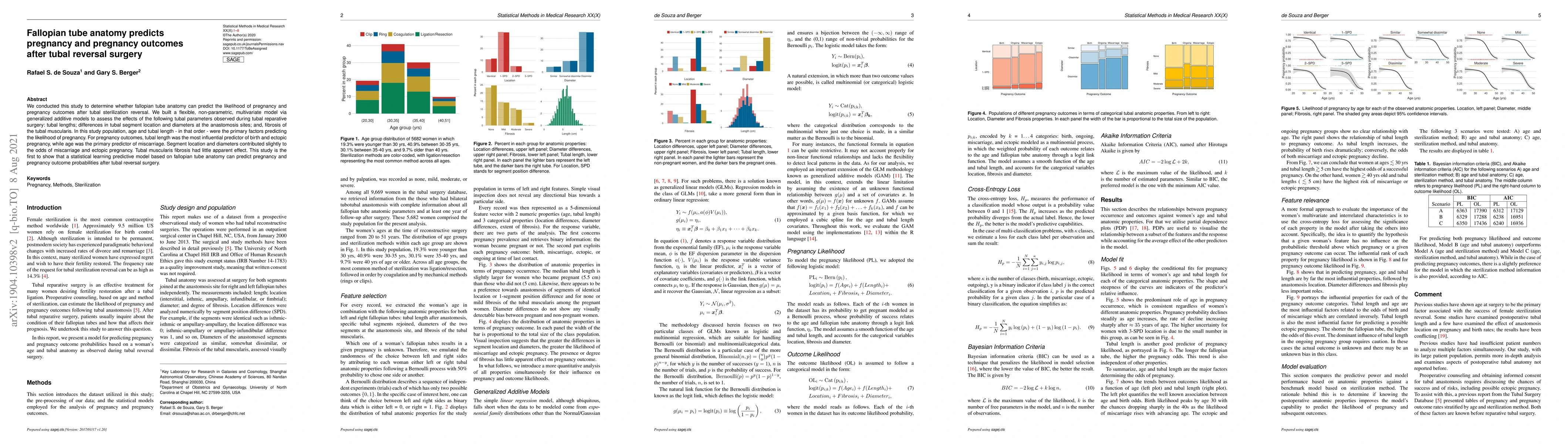 We conducted this study to determine whether fallopian tube anatomy can predict the likelihood of pregnancy and pregnancy outcomes after tubal sterilization reversal. We built a flexible, non-parametric, multivariate model via generalized additive models to assess the effects of the following tubal parameters observed during tubal reparative surgery: tubal lengths; differences in tubal segment location, and diameters at the anastomosis sites; and, fibrosis of the tubal muscularis. In this study population, age and tubal length - in that order - were the primary factors predicting the likelihood of pregnancy. For pregnancy outcomes, tubal length was the most influential predictor of birth and ectopic pregnancy, while age was the primary predictor of miscarriage. Segment location and diameters contributed slightly to the odds of miscarriage and ectopic pregnancy. Tubal muscularis fibrosis had a little apparent effect. This study is the first to show that a statistical learning predictive model based on fallopian tube anatomy can predict pregnancy and pregnancy outcome probabilities after tubal reversal surgery.