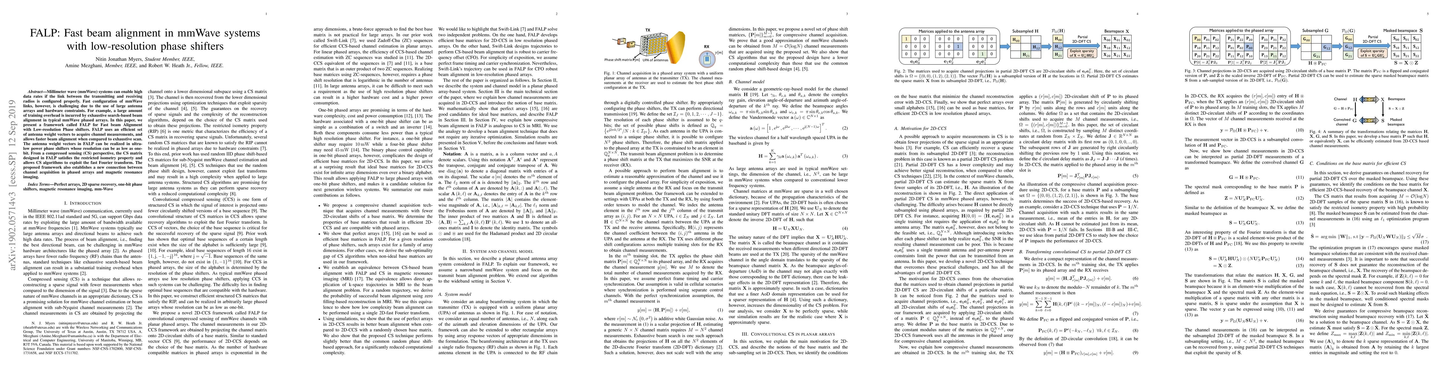 Title: FALP: Fast beam alignment in mmWave systems with low-resolution phase shifters Summary: The paper introduces FALP, a framework for efficient beam alignment in mmWave systems using low-resolution phase shifters, which reduces training overhead and leverages compressed sensing for faster channel acquisition compared to exhaustive search methods.