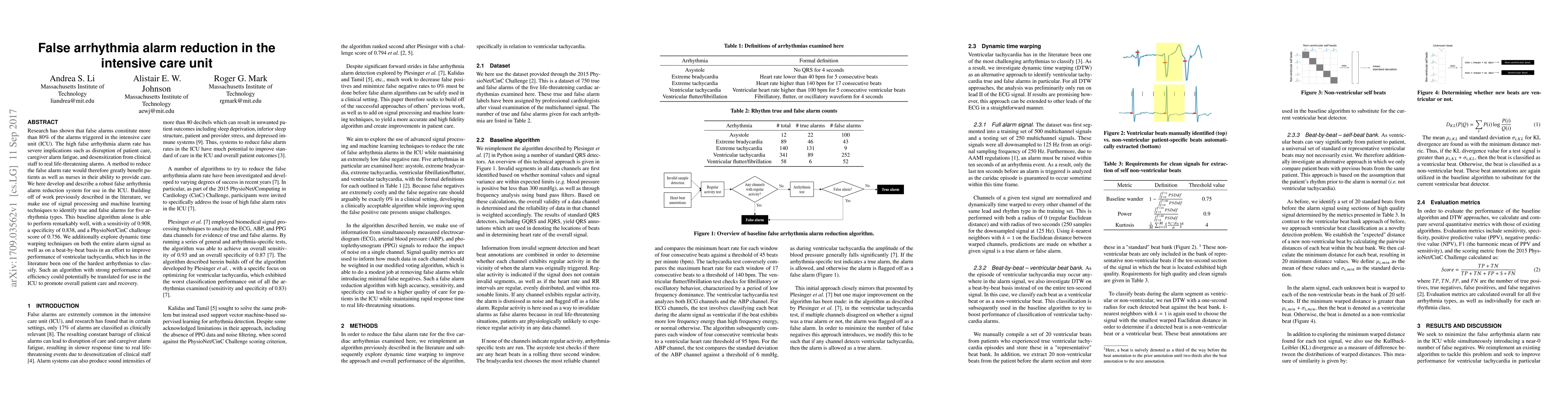 Research has shown that false alarms constitute more than 80% of the alarms triggered in the intensive care unit (ICU). The high false arrhythmia alarm rate has severe implications such as disruption of patient care, caregiver alarm fatigue, and desensitization from clinical staff to real life-threatening alarms. A method to reduce the false alarm rate would therefore greatly benefit patients as well as nurses in their ability to provide care. We here develop and describe a robust false arrhythmia alarm reduction system for use in the ICU. Building off of work previously described in the literature, we make use of signal processing and machine learning techniques to identify true and false alarms for five arrhythmia types. This baseline algorithm alone is able to perform remarkably well, with a sensitivity of 0.908, a specificity of 0.838, and a PhysioNet/CinC challenge score of 0.756. We additionally explore dynamic time warping techniques on both the entire alarm signal as well as on a beat-by-beat basis in an effort to improve performance of ventricular tachycardia, which has in the literature been one of the hardest arrhythmias to classify. Such an algorithm with strong performance and efficiency could potentially be translated for use in the ICU to promote overall patient care and recovery.