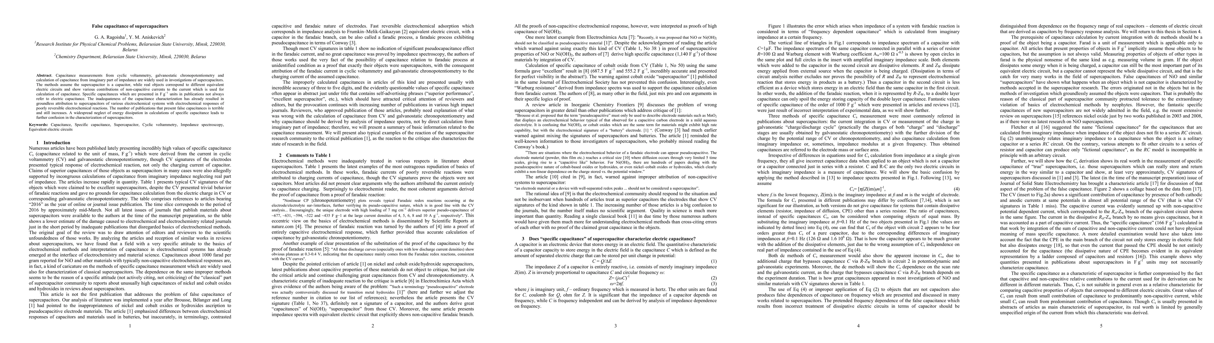 Capacitance measurements from cyclic voltammetry, galvanostatic chronopotentiometry and calculation of capacitance from imaginary part of impedance are widely used in investigations of supercapacitors. The methods assume the supercapacitor is a capacitor, while real objects correspond to different equivalent electric circuits and show various contributions of non-capacitive currents to the current which is used for calculation of capacitance. Specific capacitances which are presented in F g-1 units in publications not always refer to electric capacitance. The inadequateness of the capacitance characterization has already resulted in groundless attribution to supercapacitors of various systems with electrochemical responses of poorly reversible electrochemical reactions. The number of publications that present false capacitances is terrible and still increases. A widespread neglect of energy dissipation in calculations of specific capacitance leads to further confusion in the characterization of supercapacitors.