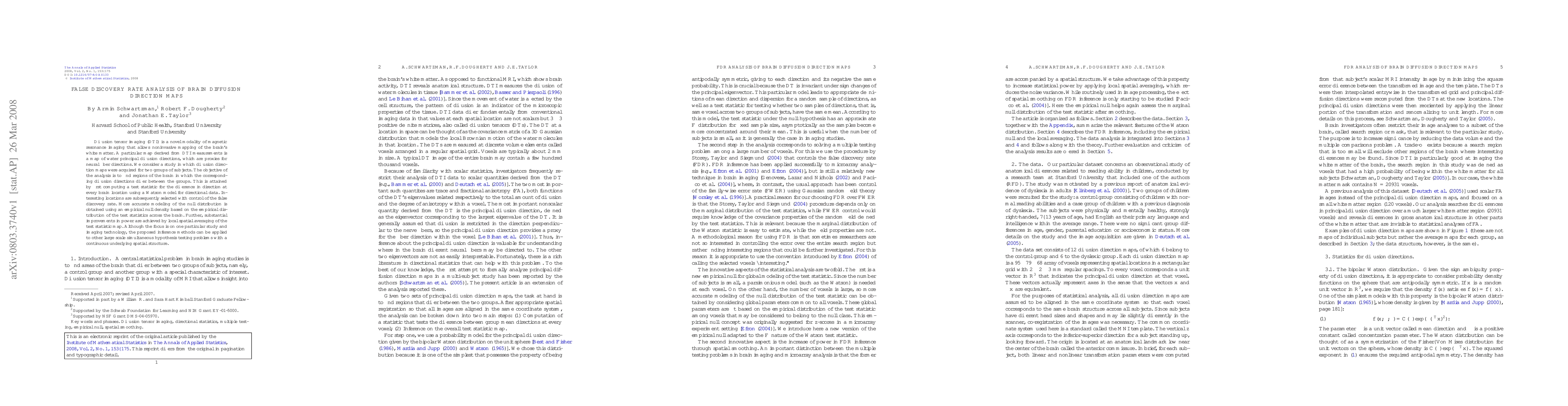 This paper proposes a method for analyzing diffusion tensor imaging data to identify brain regions where water diffusion direction differs between two groups, using a false discovery rate approach and local spatial averaging to enhance accuracy and power, applicable to other large-scale simultaneous hypothesis testing.