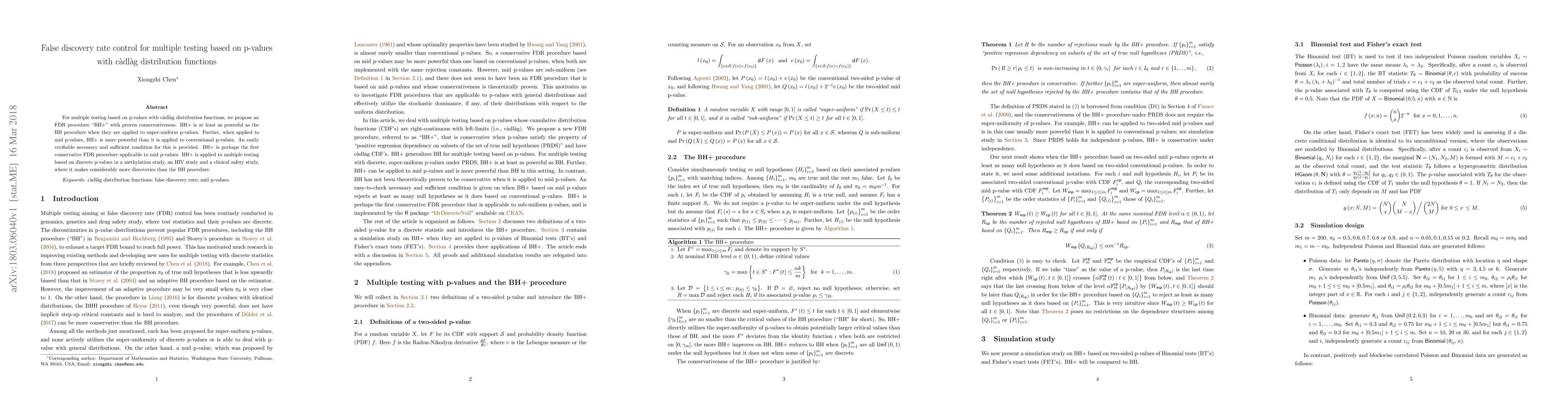 This paper proposes a new FDR procedure, "BH+", for multiple testing based on p-values with càdlàg distribution functions, which is shown to be at least as powerful as the BH procedure for super-uniform p-values and more powerful for mid p-values. BH+ is applied to various studies, demonstrating greater discovery rates compared to the BH procedure.