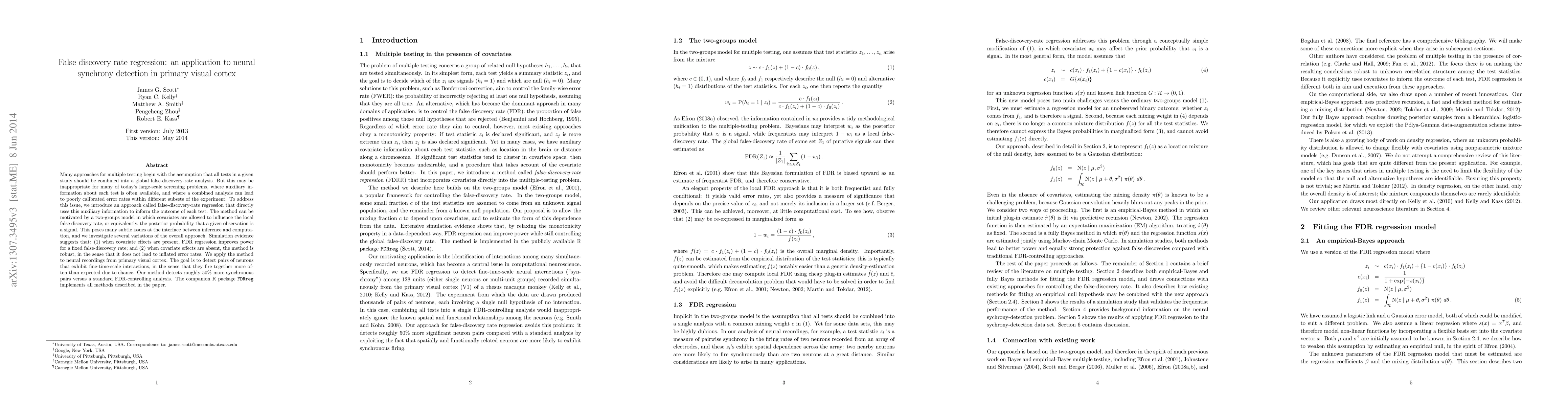 This paper introduces false-discovery-rate regression to improve the detection of neural synchrony in primary visual cortex, addressing the limitations of global FDR analysis in large-scale screening. The method leverages auxiliary information to enhance power and robustness, detecting 50% more synchronous neuron pairs compared to standard FDR-control methods.