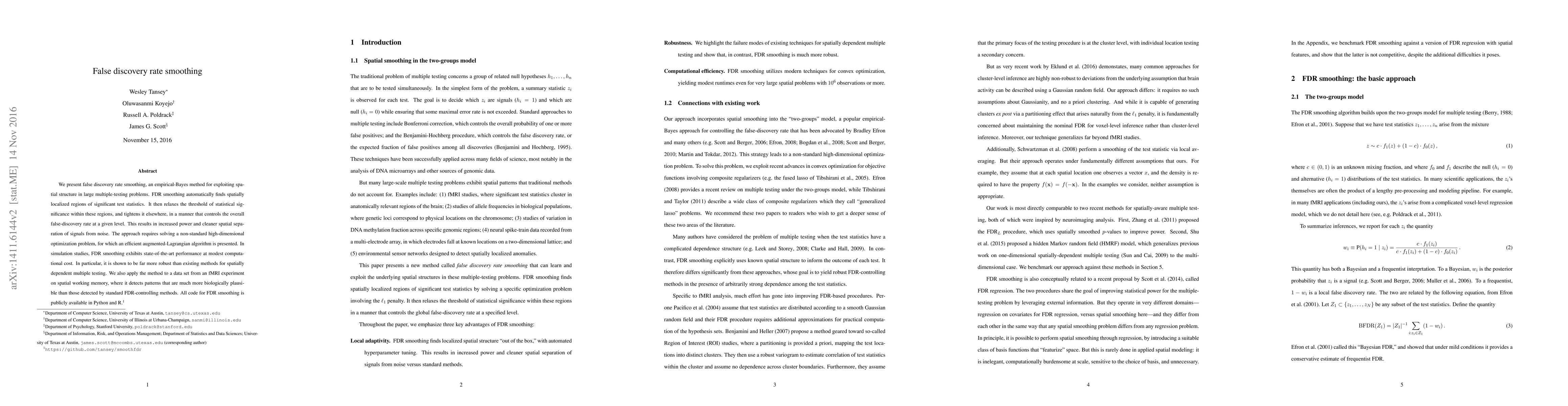 False discovery rate smoothing is an empirical-Bayes method that leverages spatial structure in multiple-testing scenarios to enhance power and clarity in identifying significant regions. It employs an augmented-Lagrangian algorithm to solve a high-dimensional optimization problem, demonstrating superior performance in simulations and real fMRI data.