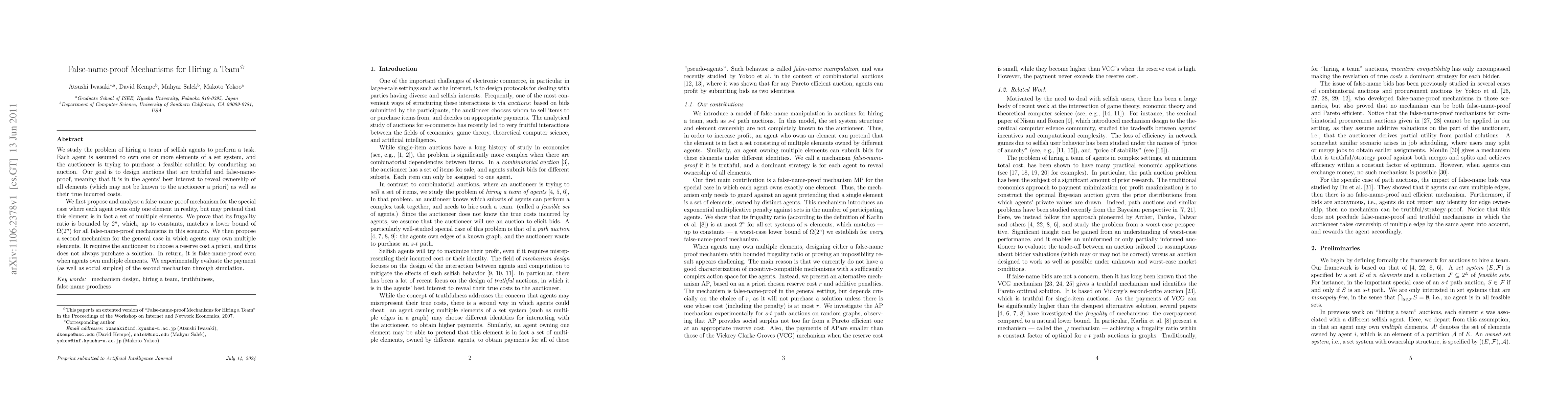 We study the problem of hiring a team of selfish agents to perform a task. Each agent is assumed to own one or more elements of a set system, and the auctioneer is trying to purchase a feasible solution by conducting an auction. Our goal is to design auctions that are truthful and false-name-proof, meaning that it is in the agents' best interest to reveal ownership of all elements (which may not be known to the auctioneer a priori) as well as their true incurred costs. We first propose and analyze a false-name-proof mechanism for the special case where each agent owns only one element in reality, but may pretend that this element is in fact a set of multiple elements. We prove that its frugality ratio is bounded by $2^n$, which, up to constants, matches a lower bound of $\Omega(2^n)$ for all false-name-proof mechanisms in this scenario. We then propose a second mechanism for the general case in which agents may own multiple elements. It requires the auctioneer to choose a reserve cost a priori, and thus does not always purchase a solution. In return, it is false-name-proof even when agents own multiple elements. We experimentally evaluate the payment (as well as social surplus) of the second mechanism through simulation.