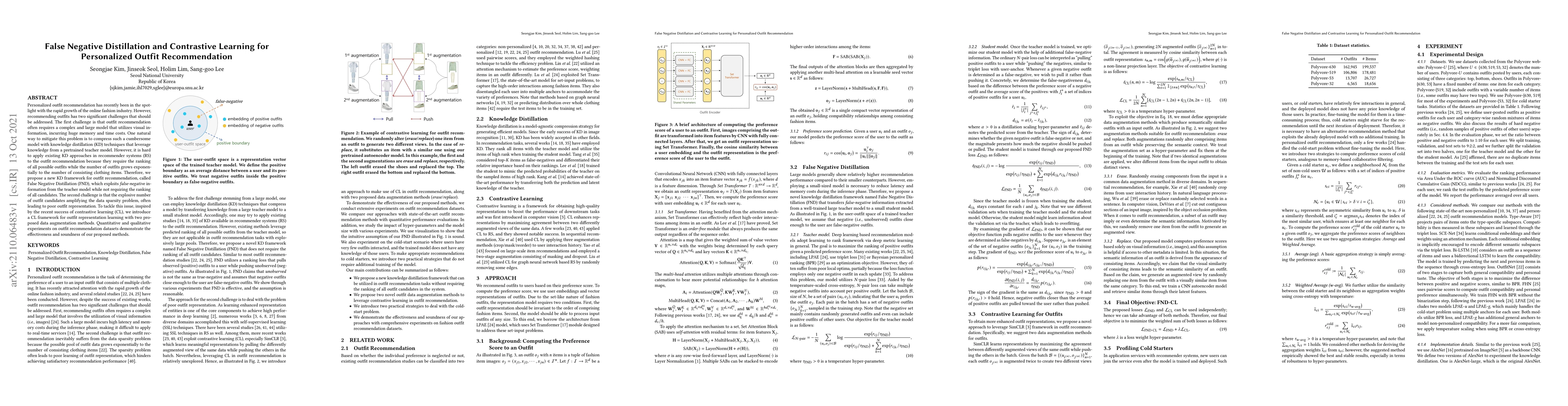 This paper proposes False Negative Distillation (FND) to compress large models for personalized outfit recommendation, addressing the challenge of ranking exponentially large outfit candidates. It also introduces contrastive learning with data augmentation to tackle data sparsity issues, enhancing outfit representation learning. Experiments show the effectiveness of these methods.