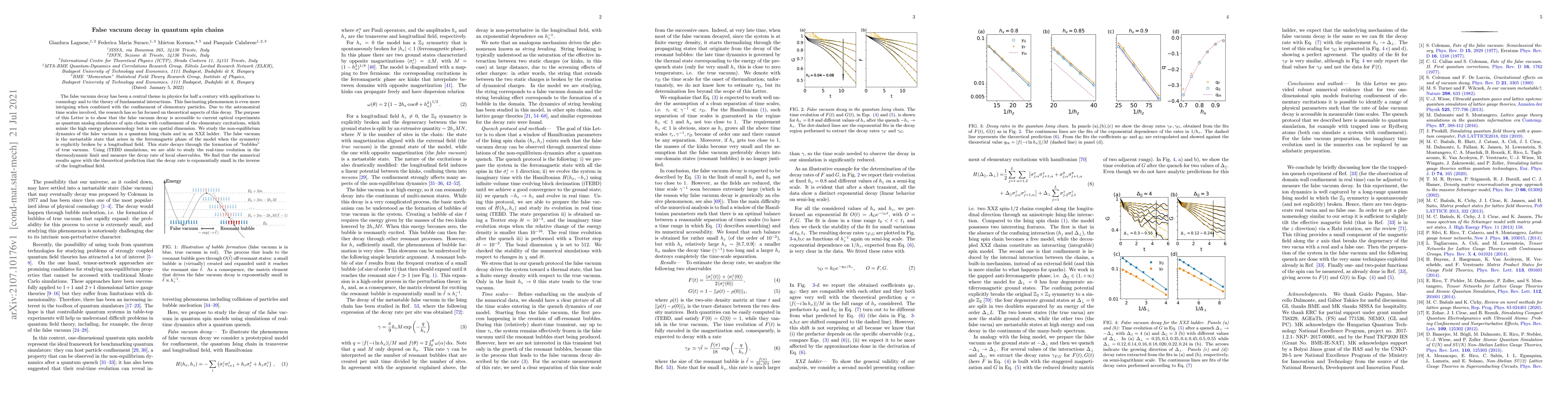 This paper investigates the false vacuum decay in quantum spin chains using optical experiments as quantum analog simulators. It demonstrates that the phenomenon can be studied in quantum Ising and XXZ ladder models, showing that the decay rate of the false vacuum state is exponentially small, in agreement with theoretical predictions.