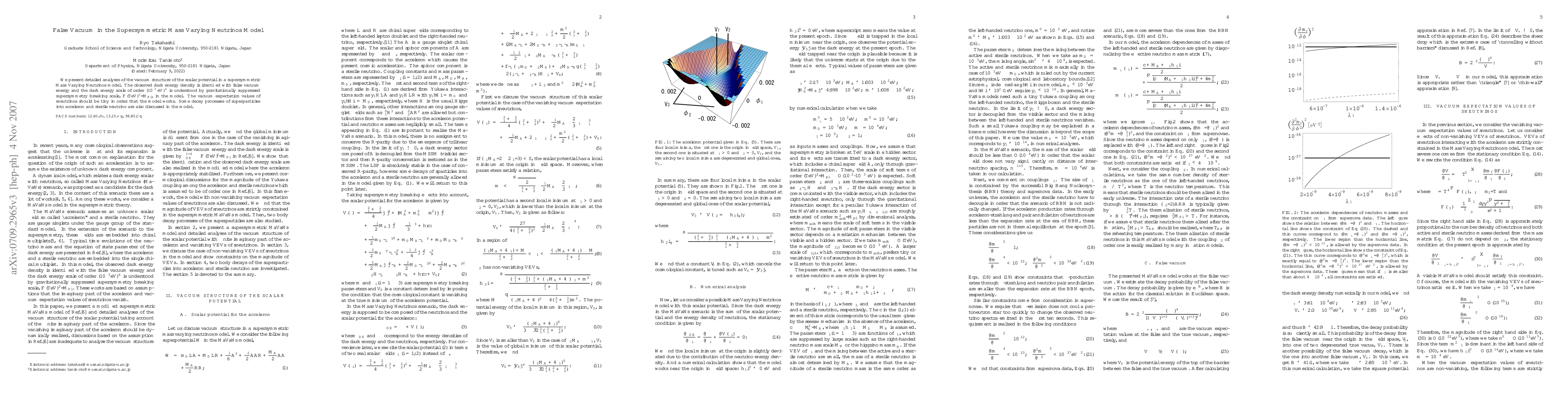 This research explores the vacuum structure in a supersymmetric Mass Varying Neutrinos model, where the dark energy density corresponds to false vacuum energy linked to a gravitationally suppressed supersymmetry breaking scale. The model requires small vacuum expectation values of sneutrinos to function correctly and includes discussions on superparticle decay processes.