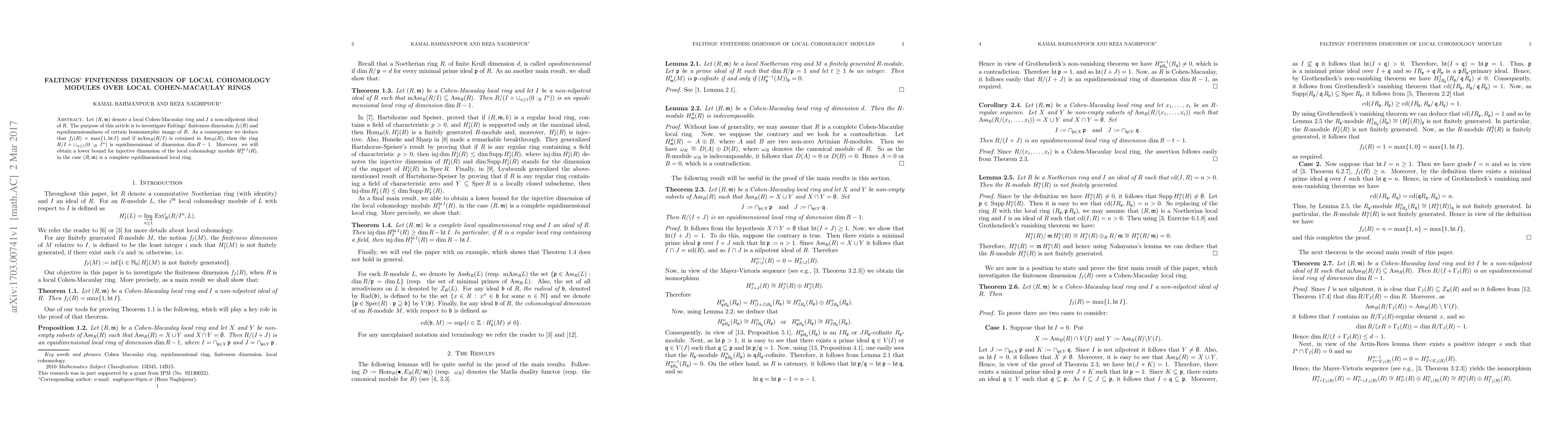 Let $(R, \frak m)$ denote a local Cohen-Macaulay ring and $I$ a non-nilpotent ideal of $R$. The purpose of this article is to investigate Faltings' finiteness dimension $f_I(R)$ and equidimensionalness of certain homomorphic image of $R$. As a consequence we deduce that $f_I(R)={\rm max}\{1, {\rm ht}\ I\}$ and if ${\frak m}\mathrm{Ass}_R(R/I)$ is cotained in Ass$_R(R)$, then the ring $R/ I+\cup_{n\geq 1}(0:_RI^n)$ is equidimensional of dimension $\dim R-1$. Moreover, we will obtain a lower bound for injective dimension of the local cohomology module $H^{{\rm ht}\ I}_I(R)$, in the case $(R, \frak m)$ is a complete equidimensional local ring.
