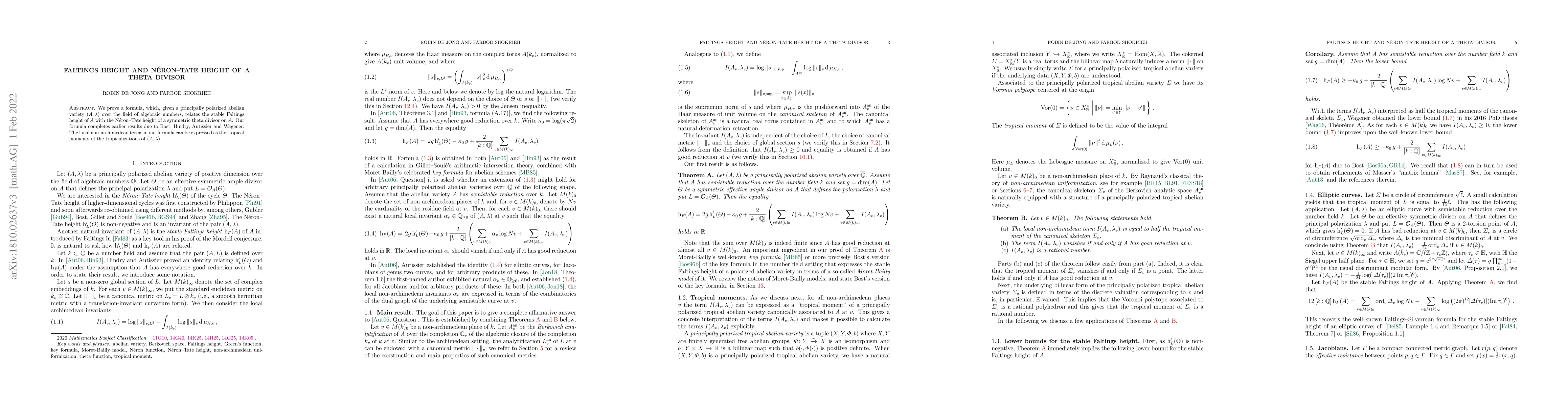 This paper establishes a formula linking the stable Faltings height of a principally polarized abelian variety with the N\'eron-Tate height of a symmetric theta divisor on it, completing prior work by Bost, Hindry, Autissier, and Wagener. The local non-archimedean terms are expressed through tropical moments of the tropicalizations of the variety.