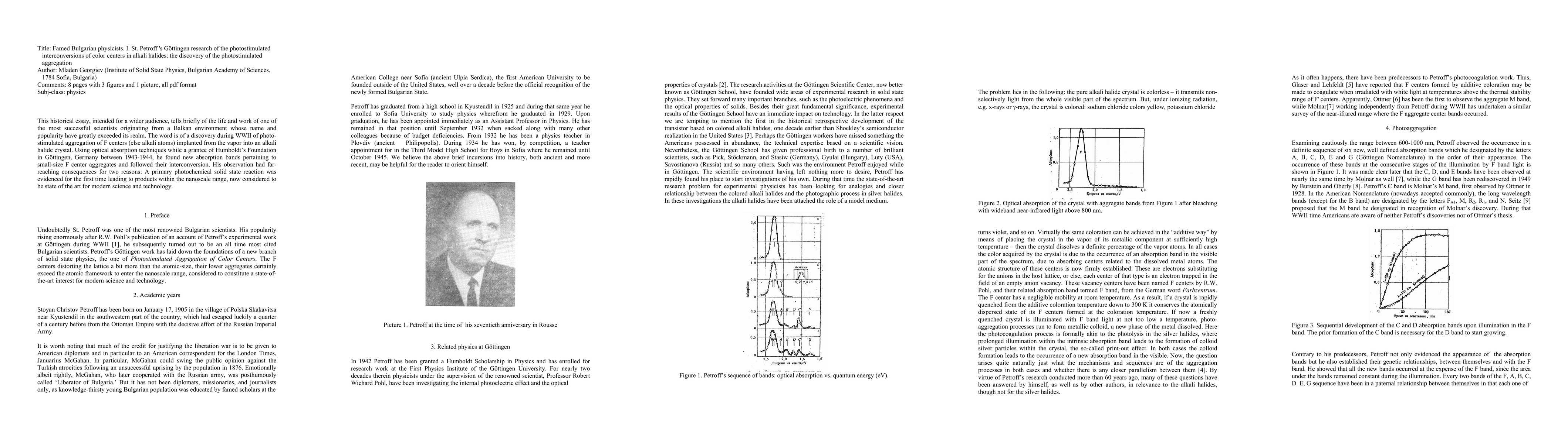 Summary: This paper recounts the life and achievements of St. Petroff, a renowned Bulgarian physicist whose research in Göttingen during WWII led to the discovery of photostimulated aggregation of F centers in alkali halides, revealing new absorption bands and marking the first evidence of a primary photochemical solid-state reaction.