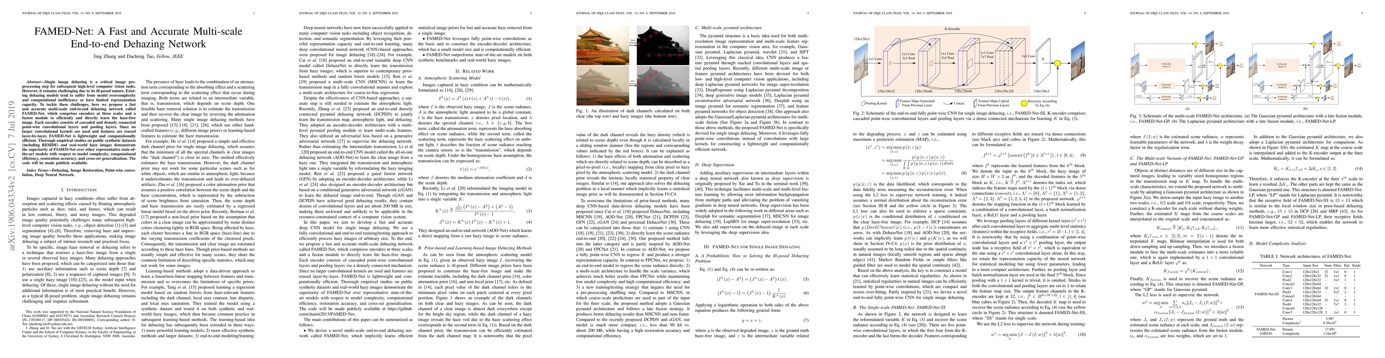 FAMED-Net introduces a novel multi-scale architecture with point-wise convolutions that efficiently learns haze-free images, demonstrating a lightweight and computationally efficient solution for single image dehazing.