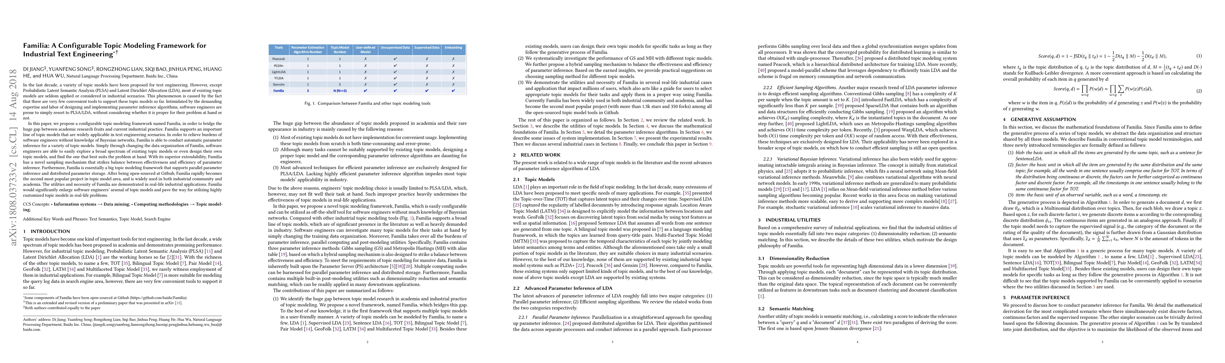The paper introduces Familia, a configurable topic modeling framework designed to bridge the gap between academic topic modeling research and industrial applications. Familia automates parameter inference and supports a wide range of topic models, making it accessible for software engineers and enhancing the use of customized models in practical scenarios.