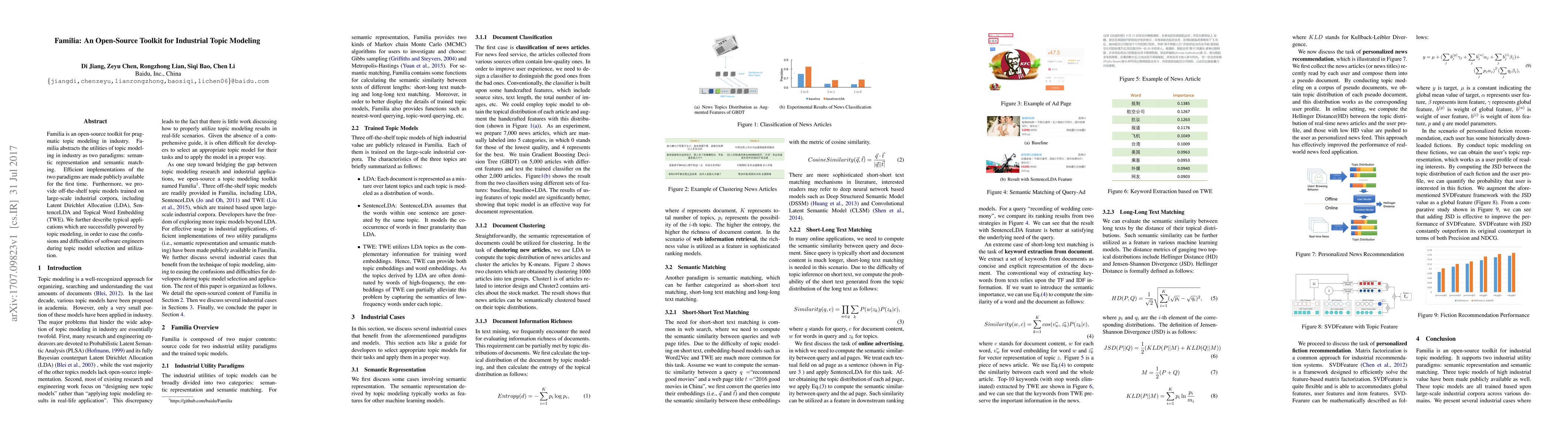Familia is an open-source toolkit for industrial topic modeling, offering efficient implementations of semantic representation and matching. It includes pre-trained models like LDA, SentenceLDA, and TWE, and guides on their applications to aid software engineers.