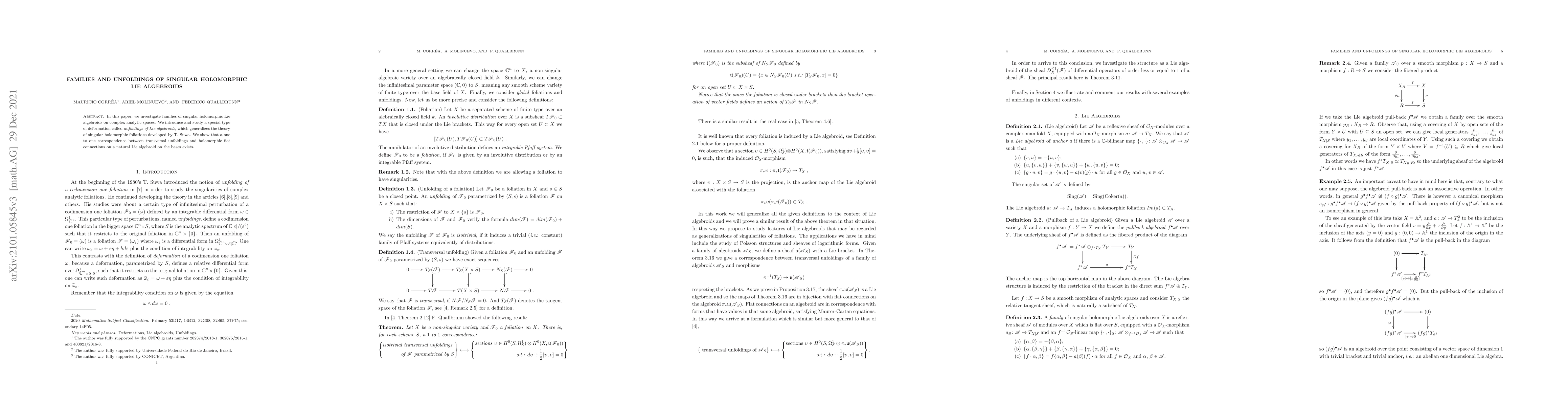 This paper explores families of singular holomorphic Lie algebroids on complex analytic spaces, introducing and studying unfoldings, a generalization of Suwa's theory of singular holomorphic foliations, and demonstrates a one-to-one correspondence between transversal unfoldings and holomorphic flat connections.