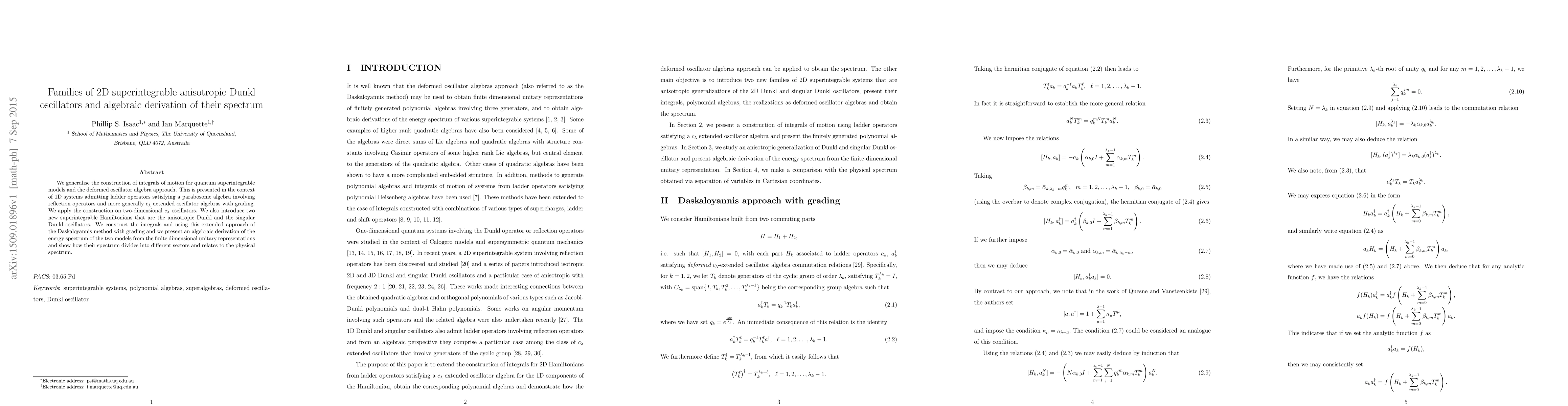 We generalise the construction of integrals of motion for quantum superintegrable models and the deformed oscillator algebra approach. This is presented in the context of 1D systems admitting ladder operators satisfying a parabosonic algebra involving reflection operators and more generally $c_{\lambda}$ extended oscillator algebras with grading. We apply the construction on two-dimensional $c_{\lambda}$ oscillators. We also introduce two new superintegrable Hamiltonians that are the anisotropic Dunkl and the singular Dunkl oscillators. We construct the integrals and using this extended approach of the Daskaloyannis method with grading and we present an algebraic derivation of the energy spectrum of the two models from the finite dimensional unitary representations and show how their spectrum divides into different sectors and relates to the physical spectrum.